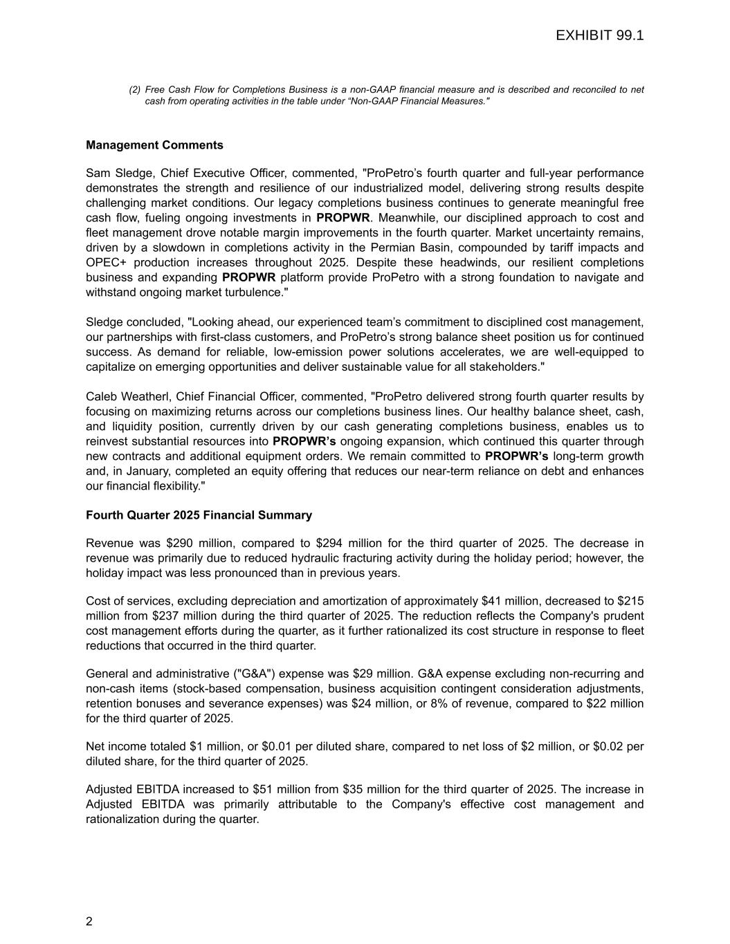 (2) Free Cash Flow for Completions Business is a non-GAAP financial measure and is described and reconciled to net cash from operating activities in the table under “Non-GAAP Financial Measures." Management Comments Sam Sledge, Chief Executive Officer, commented, "ProPetro’s fourth quarter and full-year performance demonstrates the strength and resilience of our industrialized model, delivering strong results despite challenging market conditions. Our legacy completions business continues to generate meaningful free cash flow, fueling ongoing investments in PROPWR. Meanwhile, our disciplined approach to cost and fleet management drove notable margin improvements in the fourth quarter. Market uncertainty remains, driven by a slowdown in completions activity in the Permian Basin, compounded by tariff impacts and OPEC+ production increases throughout 2025. Despite these headwinds, our resilient completions business and expanding PROPWR platform provide ProPetro with a strong foundation to navigate and withstand ongoing market turbulence." Sledge concluded, "Looking ahead, our experienced team’s commitment to disciplined cost management, our partnerships with first-class customers, and ProPetro’s strong balance sheet position us for continued success. As demand for reliable, low-emission power solutions accelerates, we are well-equipped to capitalize on emerging opportunities and deliver sustainable value for all stakeholders." Caleb Weatherl, Chief Financial Officer, commented, "ProPetro delivered strong fourth quarter results by focusing on maximizing returns across our completions business lines. Our healthy balance sheet, cash, and liquidity position, currently driven by our cash generating completions business, enables us to reinvest substantial resources into PROPWR’s ongoing expansion, which continued this quarter through new contracts and additional equipment orders. We remain committed to PROPWR’s long-term growth and, in January, completed an equity offering that reduces our near-term reliance on debt and enhances our financial flexibility." Fourth Quarter 2025 Financial Summary Revenue was $290 million, compared to $294 million for the third quarter of 2025. The decrease in revenue was primarily due to reduced hydraulic fracturing activity during the holiday period; however, the holiday impact was less pronounced than in previous years. Cost of services, excluding depreciation and amortization of approximately $41 million, decreased to $215 million from $237 million during the third quarter of 2025. The reduction reflects the Company's prudent cost management efforts during the quarter, as it further rationalized its cost structure in response to fleet reductions that occurred in the third quarter. General and administrative ("G&A") expense was $29 million. G&A expense excluding non-recurring and non-cash items (stock-based compensation, business acquisition contingent consideration adjustments, retention bonuses and severance expenses) was $24 million, or 8% of revenue, compared to $22 million for the third quarter of 2025. Net income totaled $1 million, or $0.01 per diluted share, compared to net loss of $2 million, or $0.02 per diluted share, for the third quarter of 2025. Adjusted EBITDA increased to $51 million from $35 million for the third quarter of 2025. The increase in Adjusted EBITDA was primarily attributable to the Company's effective cost management and rationalization during the quarter. 2