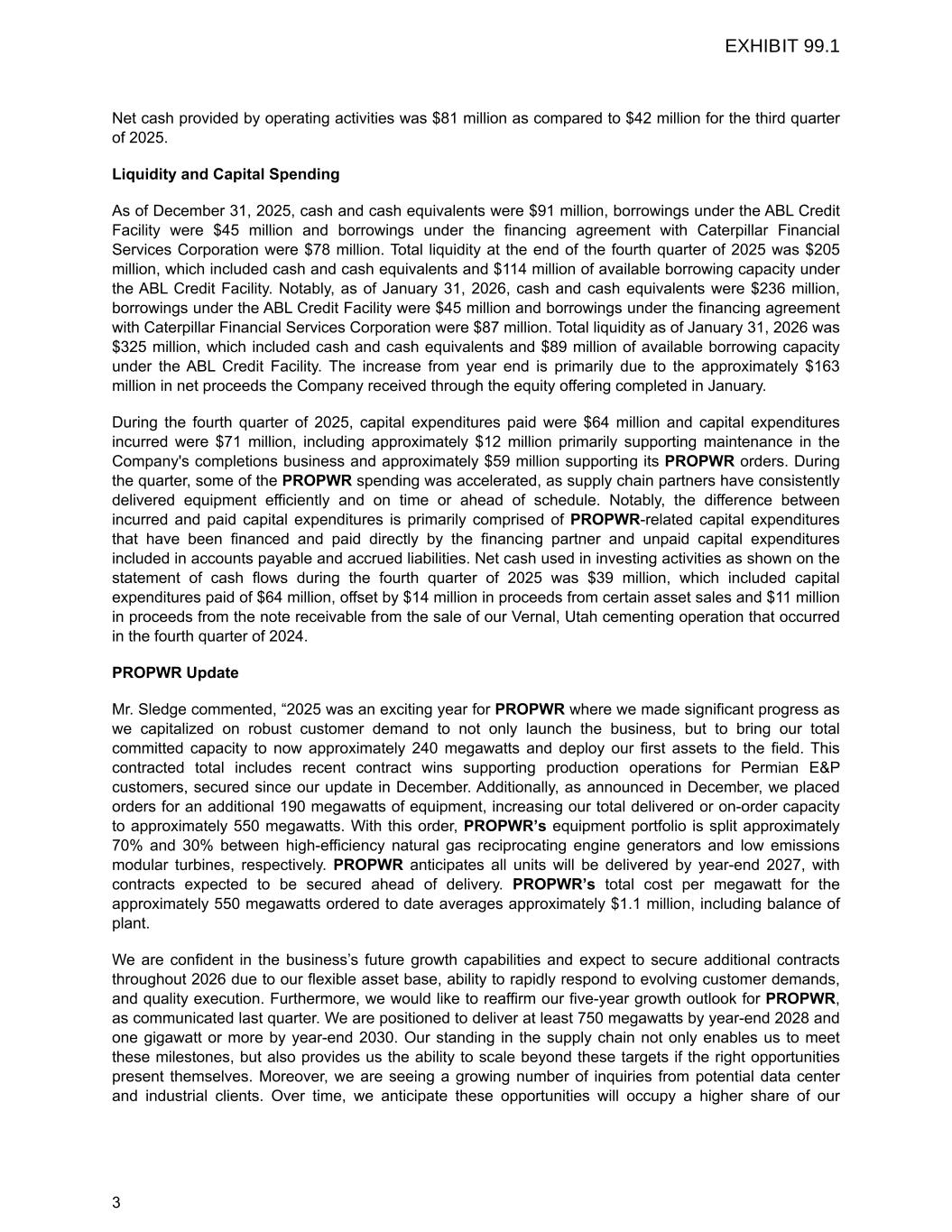Net cash provided by operating activities was $81 million as compared to $42 million for the third quarter of 2025. Liquidity and Capital Spending As of December 31, 2025, cash and cash equivalents were $91 million, borrowings under the ABL Credit Facility were $45 million and borrowings under the financing agreement with Caterpillar Financial Services Corporation were $78 million. Total liquidity at the end of the fourth quarter of 2025 was $205 million, which included cash and cash equivalents and $114 million of available borrowing capacity under the ABL Credit Facility. Notably, as of January 31, 2026, cash and cash equivalents were $236 million, borrowings under the ABL Credit Facility were $45 million and borrowings under the financing agreement with Caterpillar Financial Services Corporation were $87 million. Total liquidity as of January 31, 2026 was $325 million, which included cash and cash equivalents and $89 million of available borrowing capacity under the ABL Credit Facility. The increase from year end is primarily due to the approximately $163 million in net proceeds the Company received through the equity offering completed in January. During the fourth quarter of 2025, capital expenditures paid were $64 million and capital expenditures incurred were $71 million, including approximately $12 million primarily supporting maintenance in the Company's completions business and approximately $59 million supporting its PROPWR orders. During the quarter, some of the PROPWR spending was accelerated, as supply chain partners have consistently delivered equipment efficiently and on time or ahead of schedule. Notably, the difference between incurred and paid capital expenditures is primarily comprised of PROPWR-related capital expenditures that have been financed and paid directly by the financing partner and unpaid capital expenditures included in accounts payable and accrued liabilities. Net cash used in investing activities as shown on the statement of cash flows during the fourth quarter of 2025 was $39 million, which included capital expenditures paid of $64 million, offset by $14 million in proceeds from certain asset sales and $11 million in proceeds from the note receivable from the sale of our Vernal, Utah cementing operation that occurred in the fourth quarter of 2024. PROPWR Update Mr. Sledge commented, “2025 was an exciting year for PROPWR where we made significant progress as we capitalized on robust customer demand to not only launch the business, but to bring our total committed capacity to now approximately 240 megawatts and deploy our first assets to the field. This contracted total includes recent contract wins supporting production operations for Permian E&P customers, secured since our update in December. Additionally, as announced in December, we placed orders for an additional 190 megawatts of equipment, increasing our total delivered or on-order capacity to approximately 550 megawatts. With this order, PROPWR’s equipment portfolio is split approximately 70% and 30% between high-efficiency natural gas reciprocating engine generators and low emissions modular turbines, respectively. PROPWR anticipates all units will be delivered by year-end 2027, with contracts expected to be secured ahead of delivery. PROPWR’s total cost per megawatt for the approximately 550 megawatts ordered to date averages approximately $1.1 million, including balance of plant. We are confident in the business’s future growth capabilities and expect to secure additional contracts throughout 2026 due to our flexible asset base, ability to rapidly respond to evolving customer demands, and quality execution. Furthermore, we would like to reaffirm our five-year growth outlook for PROPWR, as communicated last quarter. We are positioned to deliver at least 750 megawatts by year-end 2028 and one gigawatt or more by year-end 2030. Our standing in the supply chain not only enables us to meet these milestones, but also provides us the ability to scale beyond these targets if the right opportunities present themselves. Moreover, we are seeing a growing number of inquiries from potential data center and industrial clients. Over time, we anticipate these opportunities will occupy a higher share of our 3