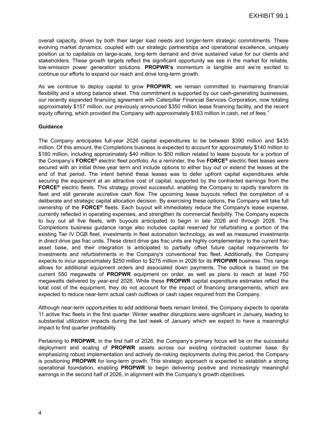 overall capacity, driven by both their larger load needs and longer-term strategic commitments. These evolving market dynamics, coupled with our strategic partnerships and operational excellence, uniquely position us to capitalize on large-scale, long-term demand and drive sustained value for our clients and stakeholders. These growth targets reflect the significant opportunity we see in the market for reliable, low-emission power generation solutions. PROPWR’s momentum is tangible and we’re excited to continue our efforts to expand our reach and drive long-term growth. As we continue to deploy capital to grow PROPWR, we remain committed to maintaining financial flexibility and a strong balance sheet. This commitment is supported by our cash-generating businesses, our recently expanded financing agreement with Caterpillar Financial Services Corporation, now totaling approximately $157 million, our previously announced $350 million lease financing facility, and the recent equity offering, which provided the Company with approximately $163 million in cash, net of fees.” Guidance The Company anticipates full-year 2026 capital expenditures to be between $390 million and $435 million. Of this amount, the Completions business is expected to account for approximately $140 million to $160 million, including approximately $40 million to $50 million related to lease buyouts for a portion of the Company’s FORCE® electric fleet portfolio. As a reminder, the five FORCE® electric fleet leases were secured with an initial three-year term and include options to either buy out or extend the leases at the end of that period. The intent behind these leases was to defer upfront capital expenditures while securing the equipment at an attractive cost of capital, supported by the contracted earnings from the FORCE® electric fleets. This strategy proved successful, enabling the Company to rapidly transform its fleet and still generate accretive cash flow. The upcoming lease buyouts reflect the completion of a deliberate and strategic capital allocation decision. By exercising these options, the Company will take full ownership of the FORCE® fleets. Each buyout will immediately reduce the Company's lease expense, currently reflected in operating expenses, and strengthen its commercial flexibility. The Company expects to buy out all five fleets, with buyouts anticipated to begin in late 2026 and through 2028. The Completions business guidance range also includes capital reserved for refurbishing a portion of the existing Tier IV DGB fleet, investments in fleet automation technology, as well as measured investments in direct drive gas frac units. These direct drive gas frac units are highly complementary to the current frac asset base, and their integration is anticipated to partially offset future capital requirements for investments and refurbishments in the Company's conventional frac fleet. Additionally, the Company expects to incur approximately $250 million to $275 million in 2026 for its PROPWR business. This range allows for additional equipment orders and associated down payments. The outlook is based on the current 550 megawatts of PROPWR equipment on order, as well as plans to reach at least 750 megawatts delivered by year-end 2028. While these PROPWR capital expenditure estimates reflect the total cost of the equipment, they do not account for the impact of financing arrangements, which are expected to reduce near-term actual cash outflows or cash capex required from the Company. Although near-term opportunities to add additional fleets remain limited, the Company expects to operate 11 active frac fleets in the first quarter. Winter weather disruptions were significant in January, leading to substantial utilization impacts during the last week of January which we expect to have a meaningful impact to first quarter profitability. Pertaining to PROPWR, in the first half of 2026, the Company’s primary focus will be on the successful deployment and scaling of PROPWR assets across our existing contracted customer base. By emphasizing robust implementation and actively de-risking deployments during this period, the Company is positioning PROPWR for long-term growth. This strategic approach is expected to establish a strong operational foundation, enabling PROPWR to begin delivering positive and increasingly meaningful earnings in the second half of 2026, in alignment with the Company’s growth objectives. 4