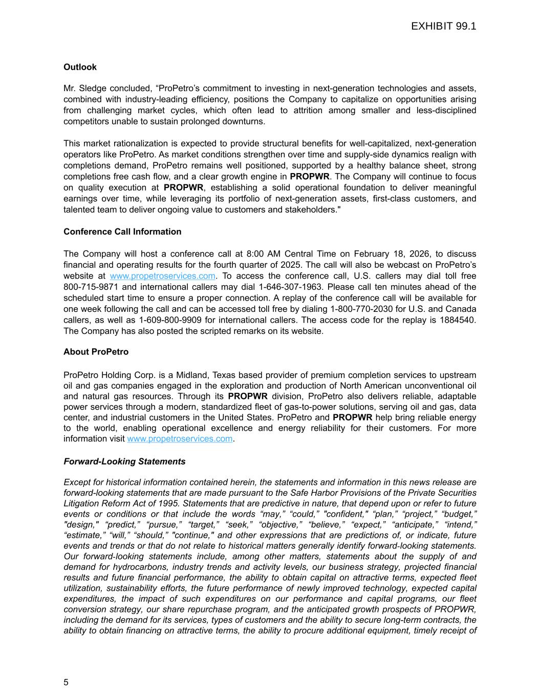 Outlook Mr. Sledge concluded, “ProPetro’s commitment to investing in next-generation technologies and assets, combined with industry-leading efficiency, positions the Company to capitalize on opportunities arising from challenging market cycles, which often lead to attrition among smaller and less-disciplined competitors unable to sustain prolonged downturns. This market rationalization is expected to provide structural benefits for well-capitalized, next-generation operators like ProPetro. As market conditions strengthen over time and supply-side dynamics realign with completions demand, ProPetro remains well positioned, supported by a healthy balance sheet, strong completions free cash flow, and a clear growth engine in PROPWR. The Company will continue to focus on quality execution at PROPWR, establishing a solid operational foundation to deliver meaningful earnings over time, while leveraging its portfolio of next-generation assets, first-class customers, and talented team to deliver ongoing value to customers and stakeholders." Conference Call Information The Company will host a conference call at 8:00 AM Central Time on February 18, 2026, to discuss financial and operating results for the fourth quarter of 2025. The call will also be webcast on ProPetro’s website at www.propetroservices.com. To access the conference call, U.S. callers may dial toll free 800-715-9871 and international callers may dial 1-646-307-1963. Please call ten minutes ahead of the scheduled start time to ensure a proper connection. A replay of the conference call will be available for one week following the call and can be accessed toll free by dialing 1-800-770-2030 for U.S. and Canada callers, as well as 1-609-800-9909 for international callers. The access code for the replay is 1884540. The Company has also posted the scripted remarks on its website. About ProPetro ProPetro Holding Corp. is a Midland, Texas based provider of premium completion services to upstream oil and gas companies engaged in the exploration and production of North American unconventional oil and natural gas resources. Through its PROPWR division, ProPetro also delivers reliable, adaptable power services through a modern, standardized fleet of gas-to-power solutions, serving oil and gas, data center, and industrial customers in the United States. ProPetro and PROPWR help bring reliable energy to the world, enabling operational excellence and energy reliability for their customers. For more information visit www.propetroservices.com. Forward-Looking Statements Except for historical information contained herein, the statements and information in this news release are forward-looking statements that are made pursuant to the Safe Harbor Provisions of the Private Securities Litigation Reform Act of 1995. Statements that are predictive in nature, that depend upon or refer to future events or conditions or that include the words “may,” “could,” "confident," “plan,” “project,” “budget,” "design," “predict,” “pursue,” “target,” “seek,” “objective,” “believe,” “expect,” “anticipate,” “intend,” “estimate,” “will,” “should,” "continue," and other expressions that are predictions of, or indicate, future events and trends or that do not relate to historical matters generally identify forward-looking statements. Our forward-looking statements include, among other matters, statements about the supply of and demand for hydrocarbons, industry trends and activity levels, our business strategy, projected financial results and future financial performance, the ability to obtain capital on attractive terms, expected fleet utilization, sustainability efforts, the future performance of newly improved technology, expected capital expenditures, the impact of such expenditures on our performance and capital programs, our fleet conversion strategy, our share repurchase program, and the anticipated growth prospects of PROPWR, including the demand for its services, types of customers and the ability to secure long-term contracts, the ability to obtain financing on attractive terms, the ability to procure additional equipment, timely receipt of 5