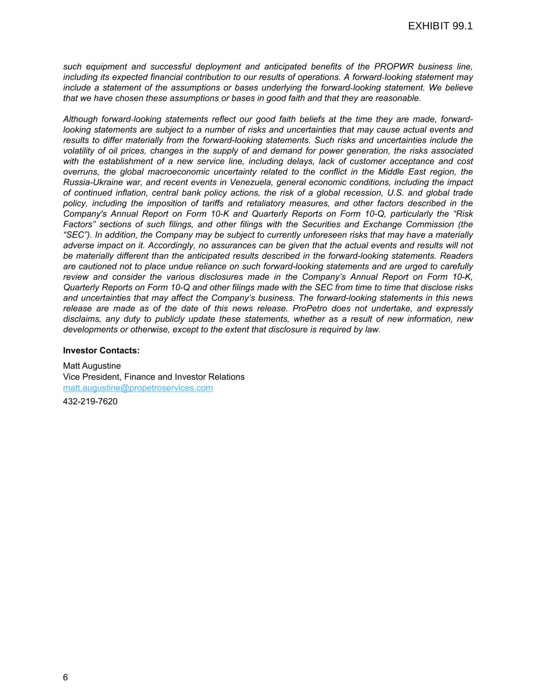 such equipment and successful deployment and anticipated benefits of the PROPWR business line, including its expected financial contribution to our results of operations. A forward-looking statement may include a statement of the assumptions or bases underlying the forward-looking statement. We believe that we have chosen these assumptions or bases in good faith and that they are reasonable. Although forward-looking statements reflect our good faith beliefs at the time they are made, forward- looking statements are subject to a number of risks and uncertainties that may cause actual events and results to differ materially from the forward-looking statements. Such risks and uncertainties include the volatility of oil prices, changes in the supply of and demand for power generation, the risks associated with the establishment of a new service line, including delays, lack of customer acceptance and cost overruns, the global macroeconomic uncertainty related to the conflict in the Middle East region, the Russia-Ukraine war, and recent events in Venezuela, general economic conditions, including the impact of continued inflation, central bank policy actions, the risk of a global recession, U.S. and global trade policy, including the imposition of tariffs and retaliatory measures, and other factors described in the Company's Annual Report on Form 10-K and Quarterly Reports on Form 10-Q, particularly the “Risk Factors” sections of such filings, and other filings with the Securities and Exchange Commission (the “SEC”). In addition, the Company may be subject to currently unforeseen risks that may have a materially adverse impact on it. Accordingly, no assurances can be given that the actual events and results will not be materially different than the anticipated results described in the forward-looking statements. Readers are cautioned not to place undue reliance on such forward-looking statements and are urged to carefully review and consider the various disclosures made in the Company’s Annual Report on Form 10-K, Quarterly Reports on Form 10-Q and other filings made with the SEC from time to time that disclose risks and uncertainties that may affect the Company’s business. The forward-looking statements in this news release are made as of the date of this news release. ProPetro does not undertake, and expressly disclaims, any duty to publicly update these statements, whether as a result of new information, new developments or otherwise, except to the extent that disclosure is required by law. Investor Contacts: Matt Augustine Vice President, Finance and Investor Relations matt.augustine@propetroservices.com 432-219-7620 6