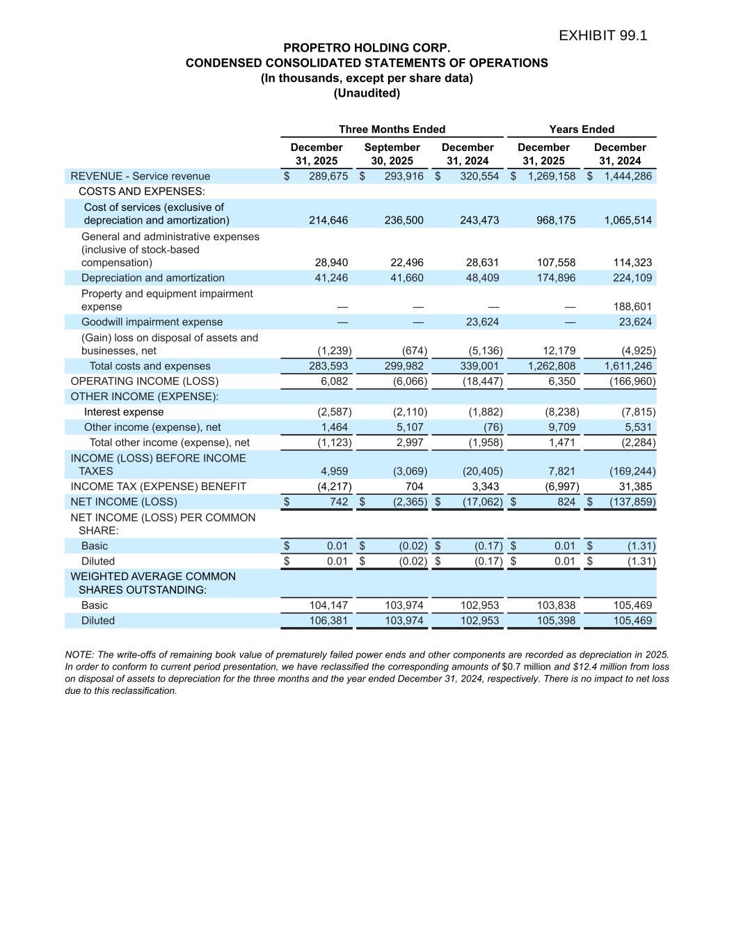 PROPETRO HOLDING CORP. CONDENSED CONSOLIDATED STATEMENTS OF OPERATIONS (In thousands, except per share data) (Unaudited) Three Months Ended Years Ended December 31, 2025 September 30, 2025 December 31, 2024 December 31, 2025 December 31, 2024 REVENUE - Service revenue $ 289,675 $ 293,916 $ 320,554 $ 1,269,158 $ 1,444,286 COSTS AND EXPENSES: Cost of services (exclusive of depreciation and amortization) 214,646 236,500 243,473 968,175 1,065,514 General and administrative expenses (inclusive of stock-based compensation) 28,940 22,496 28,631 107,558 114,323 Depreciation and amortization 41,246 41,660 48,409 174,896 224,109 Property and equipment impairment expense — — — — 188,601 Goodwill impairment expense — — 23,624 — 23,624 (Gain) loss on disposal of assets and businesses, net (1,239) (674) (5,136) 12,179 (4,925) Total costs and expenses 283,593 299,982 339,001 1,262,808 1,611,246 OPERATING INCOME (LOSS) 6,082 (6,066) (18,447) 6,350 (166,960) OTHER INCOME (EXPENSE): Interest expense (2,587) (2,110) (1,882) (8,238) (7,815) Other income (expense), net 1,464 5,107 (76) 9,709 5,531 Total other income (expense), net (1,123) 2,997 (1,958) 1,471 (2,284) INCOME (LOSS) BEFORE INCOME TAXES 4,959 (3,069) (20,405) 7,821 (169,244) INCOME TAX (EXPENSE) BENEFIT (4,217) 704 3,343 (6,997) 31,385 NET INCOME (LOSS) $ 742 $ (2,365) $ (17,062) $ 824 $ (137,859) NET INCOME (LOSS) PER COMMON SHARE: Basic $ 0.01 $ (0.02) $ (0.17) $ 0.01 $ (1.31) Diluted $ 0.01 $ (0.02) $ (0.17) $ 0.01 $ (1.31) WEIGHTED AVERAGE COMMON SHARES OUTSTANDING: Basic 104,147 103,974 102,953 103,838 105,469 Diluted 106,381 103,974 102,953 105,398 105,469 NOTE: The write-offs of remaining book value of prematurely failed power ends and other components are recorded as depreciation in 2025. In order to conform to current period presentation, we have reclassified the corresponding amounts of $0.7 million and $12.4 million from loss on disposal of assets to depreciation for the three months and the year ended December 31, 2024, respectively. There is no impact to net loss due to this reclassification.