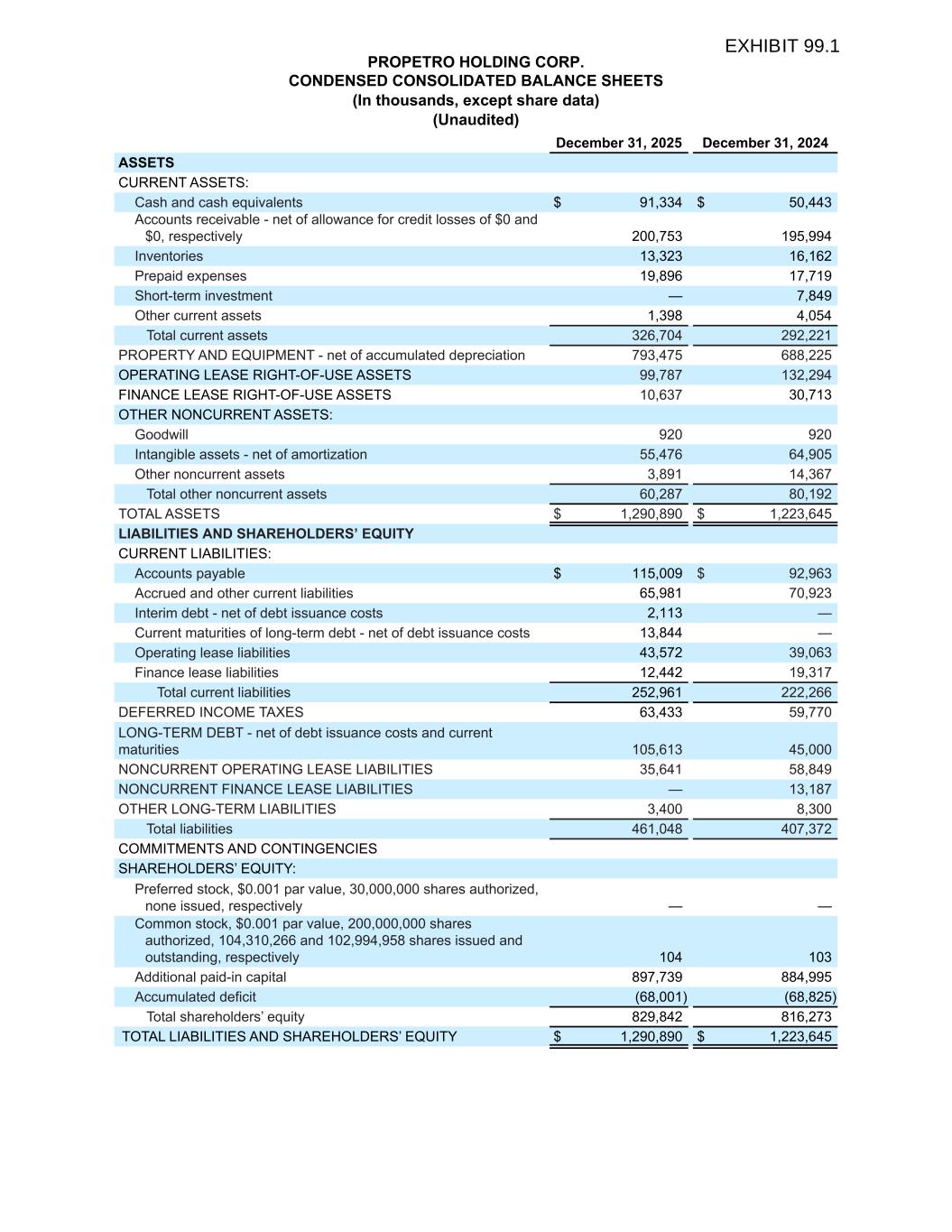 PROPETRO HOLDING CORP. CONDENSED CONSOLIDATED BALANCE SHEETS (In thousands, except share data) (Unaudited) December 31, 2025 December 31, 2024 ASSETS CURRENT ASSETS: Cash and cash equivalents $ 91,334 $ 50,443 Accounts receivable - net of allowance for credit losses of $0 and $0, respectively 200,753 195,994 Inventories 13,323 16,162 Prepaid expenses 19,896 17,719 Short-term investment — 7,849 Other current assets 1,398 4,054 Total current assets 326,704 292,221 PROPERTY AND EQUIPMENT - net of accumulated depreciation 793,475 688,225 OPERATING LEASE RIGHT-OF-USE ASSETS 99,787 132,294 FINANCE LEASE RIGHT-OF-USE ASSETS 10,637 30,713 OTHER NONCURRENT ASSETS: Goodwill 920 920 Intangible assets - net of amortization 55,476 64,905 Other noncurrent assets 3,891 14,367 Total other noncurrent assets 60,287 80,192 TOTAL ASSETS $ 1,290,890 $ 1,223,645 LIABILITIES AND SHAREHOLDERS’ EQUITY CURRENT LIABILITIES: Accounts payable $ 115,009 $ 92,963 Accrued and other current liabilities 65,981 70,923 Interim debt - net of debt issuance costs 2,113 — Current maturities of long-term debt - net of debt issuance costs 13,844 — Operating lease liabilities 43,572 39,063 Finance lease liabilities 12,442 19,317 Total current liabilities 252,961 222,266 DEFERRED INCOME TAXES 63,433 59,770 LONG-TERM DEBT - net of debt issuance costs and current maturities 105,613 45,000 NONCURRENT OPERATING LEASE LIABILITIES 35,641 58,849 NONCURRENT FINANCE LEASE LIABILITIES — 13,187 OTHER LONG-TERM LIABILITIES 3,400 8,300 Total liabilities 461,048 407,372 COMMITMENTS AND CONTINGENCIES SHAREHOLDERS’ EQUITY: Preferred stock, $0.001 par value, 30,000,000 shares authorized, none issued, respectively — — Common stock, $0.001 par value, 200,000,000 shares authorized, 104,310,266 and 102,994,958 shares issued and outstanding, respectively 104 103 Additional paid-in capital 897,739 884,995 Accumulated deficit (68,001) (68,825) Total shareholders’ equity 829,842 816,273 TOTAL LIABILITIES AND SHAREHOLDERS’ EQUITY $ 1,290,890 $ 1,223,645