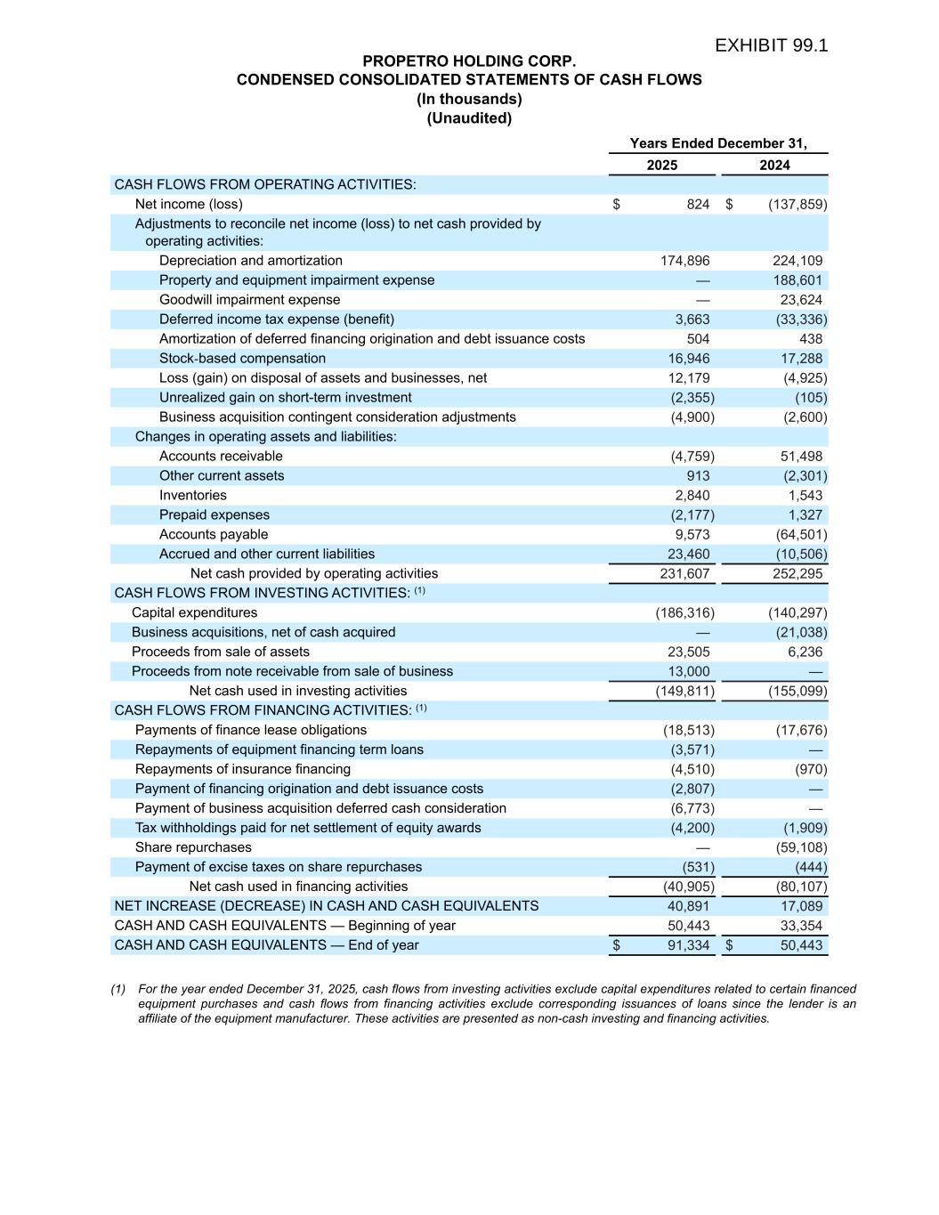 PROPETRO HOLDING CORP. CONDENSED CONSOLIDATED STATEMENTS OF CASH FLOWS (In thousands) (Unaudited) Years Ended December 31, 2025 2024 CASH FLOWS FROM OPERATING ACTIVITIES: Net income (loss) $ 824 $ (137,859) Adjustments to reconcile net income (loss) to net cash provided by operating activities: Depreciation and amortization 174,896 224,109 Property and equipment impairment expense — 188,601 Goodwill impairment expense — 23,624 Deferred income tax expense (benefit) 3,663 (33,336) Amortization of deferred financing origination and debt issuance costs 504 438 Stock-based compensation 16,946 17,288 Loss (gain) on disposal of assets and businesses, net 12,179 (4,925) Unrealized gain on short-term investment (2,355) (105) Business acquisition contingent consideration adjustments (4,900) (2,600) Changes in operating assets and liabilities: Accounts receivable (4,759) 51,498 Other current assets 913 (2,301) Inventories 2,840 1,543 Prepaid expenses (2,177) 1,327 Accounts payable 9,573 (64,501) Accrued and other current liabilities 23,460 (10,506) Net cash provided by operating activities 231,607 252,295 CASH FLOWS FROM INVESTING ACTIVITIES: (1) Capital expenditures (186,316) (140,297) Business acquisitions, net of cash acquired — (21,038) Proceeds from sale of assets 23,505 6,236 Proceeds from note receivable from sale of business 13,000 — Net cash used in investing activities (149,811) (155,099) CASH FLOWS FROM FINANCING ACTIVITIES: (1) Payments of finance lease obligations (18,513) (17,676) Repayments of equipment financing term loans (3,571) — Repayments of insurance financing (4,510) (970) Payment of financing origination and debt issuance costs (2,807) — Payment of business acquisition deferred cash consideration (6,773) — Tax withholdings paid for net settlement of equity awards (4,200) (1,909) Share repurchases — (59,108) Payment of excise taxes on share repurchases (531) (444) Net cash used in financing activities (40,905) (80,107) NET INCREASE (DECREASE) IN CASH AND CASH EQUIVALENTS 40,891 17,089 CASH AND CASH EQUIVALENTS — Beginning of year 50,443 33,354 CASH AND CASH EQUIVALENTS — End of year $ 91,334 $ 50,443 (1) For the year ended December 31, 2025, cash flows from investing activities exclude capital expenditures related to certain financed equipment purchases and cash flows from financing activities exclude corresponding issuances of loans since the lender is an affiliate of the equipment manufacturer. These activities are presented as non-cash investing and financing activities.