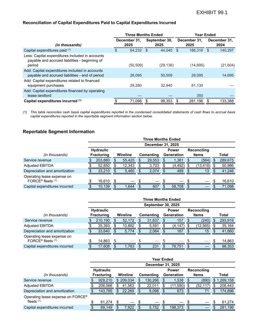 Reconciliation of Capital Expenditures Paid to Capital Expenditures Incurred Three Months Ended Year Ended (in thousands) December 31, 2025 September 30, 2025 December 31, 2025 December 31, 2024 Capital expenditures paid (1) $ 64,232 $ 44,040 $ 186,316 $ 140,297 Less: Capital expenditures included in accounts payable and accrued liabilities - beginning of period (50,509) (29,136) (14,695) (21,604) Add: Capital expenditures included in accounts payable and accrued liabilities - end of period 28,095 50,509 28,095 14,695 Add: Capital expenditures related to financed equipment purchases 29,280 32,940 81,130 — Add: Capital expenditures financed by operating lease landlord — — 350 — Capital expenditures incurred (1) $ 71,098 $ 98,353 $ 281,196 $ 133,388 (1) This table reconciles cash basis capital expenditures reported in the condensed consolidated statements of cash flows to accrual basis capital expenditures reported in the reportable segment information section below. Reportable Segment Information Three Months Ended December 31, 2025 (in thousands) Hydraulic Fracturing Wireline Cementing Power Generation Reconciling Items Total Service revenue $ 203,880 $ 55,425 $ 29,553 $ 1,381 $ (564) $ 289,675 Adjusted EBITDA $ 52,850 $ 12,343 $ 3,703 $ (4,492) $ (13,418) $ 50,986 Depreciation and amortization $ 33,210 $ 5,460 $ 2,074 $ 489 $ 13 $ 41,246 Operating lease expense on FORCE® fleets (1) $ 16,610 $ — $ — $ — $ — $ 16,610 Capital expenditures incurred $ 10,139 $ 1,644 $ 607 $ 58,708 $ — $ 71,098 Three Months Ended September 30, 2025 (in thousands) Hydraulic Fracturing Wireline Cementing Power Generation Reconciling Items Total Service revenue $ 210,190 $ 52,172 $ 31,637 $ 157 $ (240) $ 293,916 Adjusted EBITDA $ 35,393 $ 10,892 $ 5,591 $ (4,147) $ (12,565) $ 35,164 Depreciation and amortization $ 33,640 $ 5,774 $ 2,064 $ 167 $ 15 $ 41,660 Operating lease expense on FORCE® fleets (1) $ 14,863 $ — $ — $ — $ — $ 14,863 Capital expenditures incurred $ 17,608 $ 1,763 $ 231 $ 78,751 $ — $ 98,353 Year Ended December 31, 2025 (in thousands) Hydraulic Fracturing Wireline Cementing Power Generation Reconciling Items Total Service revenue $ 929,210 $ 209,034 $ 130,266 $ 1,538 $ (890) $ 1,269,158 Adjusted EBITDA $ 208,566 $ 41,563 $ 22,011 $ (11,580) $ (52,117) $ 208,443 Depreciation and amortization $ 143,785 $ 22,269 $ 8,098 $ 673 $ 71 $ 174,896 Operating lease expense on FORCE® fleets (1) $ 61,274 $ — $ — $ — $ — $ 61,274 Capital expenditures incurred $ 69,149 $ 7,922 $ 5,752 $ 198,373 $ — $ 281,196