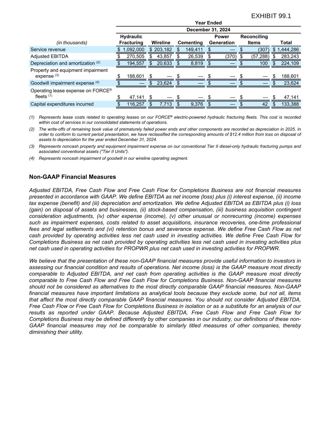Year Ended December 31, 2024 (in thousands) Hydraulic Fracturing Wireline Cementing Power Generation Reconciling Items Total Service revenue $ 1,092,000 $ 203,182 $ 149,411 $ — $ (307) $ 1,444,286 Adjusted EBITDA $ 270,505 $ 43,857 $ 26,539 $ (370) $ (57,288) $ 283,243 Depreciation and amortization (2) $ 194,557 $ 20,633 $ 8,819 $ — $ 100 $ 224,109 Property and equipment impairment expense (3) $ 188,601 $ — $ — $ — $ — $ 188,601 Goodwill impairment expense (4) $ — $ 23,624 $ — $ — $ — $ 23,624 Operating lease expense on FORCE® fleets (1) $ 47,141 $ — $ — $ — $ — $ 47,141 Capital expenditures incurred $ 116,257 $ 7,713 $ 9,376 $ — $ 42 $ 133,388 (1) Represents lease costs related to operating leases on our FORCE® electric-powered hydraulic fracturing fleets. This cost is recorded within cost of services in our consolidated statements of operations. (2) The write-offs of remaining book value of prematurely failed power ends and other components are recorded as depreciation in 2025. In order to conform to current period presentation, we have reclassified the corresponding amounts of $12.4 million from loss on disposal of assets to depreciation for the year ended December 31, 2024. (3) Represents noncash property and equipment impairment expense on our conventional Tier II diesel-only hydraulic fracturing pumps and associated conventional assets ("Tier II Units"). (4) Represents noncash impairment of goodwill in our wireline operating segment. Non-GAAP Financial Measures Adjusted EBITDA, Free Cash Flow and Free Cash Flow for Completions Business are not financial measures presented in accordance with GAAP. We define EBITDA as net income (loss) plus (i) interest expense, (ii) income tax expense (benefit) and (iii) depreciation and amortization. We define Adjusted EBITDA as EBITDA plus (i) loss (gain) on disposal of assets and businesses, (ii) stock-based compensation, (iii) business acquisition contingent consideration adjustments, (iv) other expense (income), (v) other unusual or nonrecurring (income) expenses such as impairment expenses, costs related to asset acquisitions, insurance recoveries, one-time professional fees and legal settlements and (vi) retention bonus and severance expense. We define Free Cash Flow as net cash provided by operating activities less net cash used in investing activities. We define Free Cash Flow for Completions Business as net cash provided by operating activities less net cash used in investing activities plus net cash used in operating activities for PROPWR plus net cash used in investing activities for PROPWR. We believe that the presentation of these non-GAAP financial measures provide useful information to investors in assessing our financial condition and results of operations. Net income (loss) is the GAAP measure most directly comparable to Adjusted EBITDA, and net cash from operating activities is the GAAP measure most directly comparable to Free Cash Flow and Free Cash Flow for Completions Business. Non-GAAP financial measures should not be considered as alternatives to the most directly comparable GAAP financial measures. Non-GAAP financial measures have important limitations as analytical tools because they exclude some, but not all, items that affect the most directly comparable GAAP financial measures. You should not consider Adjusted EBITDA, Free Cash Flow or Free Cash Flow for Completions Business in isolation or as a substitute for an analysis of our results as reported under GAAP. Because Adjusted EBITDA, Free Cash Flow and Free Cash Flow for Completions Business may be defined differently by other companies in our industry, our definitions of these non- GAAP financial measures may not be comparable to similarly titled measures of other companies, thereby diminishing their utility.