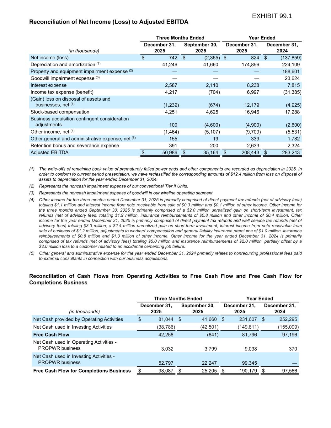 Reconciliation of Net Income (Loss) to Adjusted EBITDA Three Months Ended Year Ended (in thousands) December 31, 2025 September 30, 2025 December 31, 2025 December 31, 2024 Net income (loss) $ 742 $ (2,365) $ 824 $ (137,859) Depreciation and amortization (1) 41,246 41,660 174,896 224,109 Property and equipment impairment expense (2) — — — 188,601 Goodwill impairment expense (3) — — — 23,624 Interest expense 2,587 2,110 8,238 7,815 Income tax expense (benefit) 4,217 (704) 6,997 (31,385) (Gain) loss on disposal of assets and businesses, net (1) (1,239) (674) 12,179 (4,925) Stock-based compensation 4,251 4,625 16,946 17,288 Business acquisition contingent consideration adjustments 100 (4,600) (4,900) (2,600) Other income, net (4) (1,464) (5,107) (9,709) (5,531) Other general and administrative expense, net (5) 155 19 339 1,782 Retention bonus and severance expense 391 200 2,633 2,324 Adjusted EBITDA $ 50,986 $ 35,164 $ 208,443 $ 283,243 (1) The write-offs of remaining book value of prematurely failed power ends and other components are recorded as depreciation in 2025. In order to conform to current period presentation, we have reclassified the corresponding amounts of $12.4 million from loss on disposal of assets to depreciation for the year ended December 31, 2024. (2) Represents the noncash impairment expense of our conventional Tier II Units. (3) Represents the noncash impairment expense of goodwill in our wireline operating segment. (4) Other income for the three months ended December 31, 2025 is primarily comprised of direct payment tax refunds (net of advisory fees) totaling $1.1 million and interest income from note receivable from sale of $0.3 million and $0.1 million of other income. Other income for the three months ended September 30, 2025 is primarily comprised of a $2.0 million unrealized gain on short-term investment, tax refunds (net of advisory fees) totaling $1.9 million, insurance reimbursements of $0.8 million and other income of $0.4 million. Other income for the year ended December 31, 2025 is primarily comprised of direct payment tax refunds and well service tax refunds (net of advisory fees) totaling $3.3 million, a $2.4 million unrealized gain on short-term investment, interest income from note receivable from sale of business of $1.2 million, adjustments to workers' compensation and general liability insurance premiums of $1.0 million, insurance reimbursements of $0.8 million and $1.0 million of other income. Other income for the year ended December 31, 2024 is primarily comprised of tax refunds (net of advisory fees) totaling $5.0 million and insurance reimbursements of $2.0 million, partially offset by a $2.0 million loss to a customer related to an accidental cementing job failure. (5) Other general and administrative expense for the year ended December 31, 2024 primarily relates to nonrecurring professional fees paid to external consultants in connection with our business acquisitions. Reconciliation of Cash Flows from Operating Activities to Free Cash Flow and Free Cash Flow for Completions Business Three Months Ended Year Ended (in thousands) December 31, 2025 September 30, 2025 December 31, 2025 December 31, 2024 Net Cash provided by Operating Activities $ 81,044 $ 41,660 $ 231,607 $ 252,295 Net Cash used in Investing Activities (38,786) (42,501) (149,811) (155,099) Free Cash Flow 42,258 (841) 81,796 97,196 Net Cash used in Operating Activities - PROPWR business 3,032 3,799 9,038 370 Net Cash used in Investing Activities - PROPWR business 52,797 22,247 99,345 — Free Cash Flow for Completions Business $ 98,087 $ 25,205 $ 190,179 $ 97,566