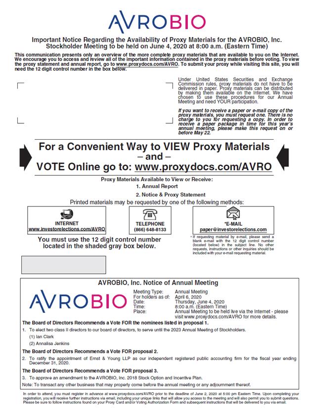 Important Notice Regarding the Availability of Proxy Materials for the AVROBIO, Inc. Stockholder Meeting to be held on June 4, 2020 at 8:00 a.m. (Eastern Time) This communication presents only an overview of the more complete proxy materials that are available to you on the Internet. We encourage you to access and review all of the important information contained in the proxy materials before voting. To view the proxy statement and annual report, go to www.proxydocs.com/AVRO. To submit your proxy while visiting this site, you will need the 12 digit control number in the box below. Under United States Securities and Exchange Commission rules, proxy materials do not have to be delivered in paper. Proxy materials can be distributed by making them available on the Internet. We have chosen to use these procedures for our Annual Meeting and need YOUR participation. If you want to receive a paper or e-mail copy of the proxy materials, you must request one. There is no charge to you for requesting a copy. In order to receive a paper package in time for this year’s annual meeting, please make this request on or before May 22. For a Convenient Way to VIEW Proxy Materials – and – VOTE Online go to: www.proxydocs.com/AVRO Proxy Materials Available to View or Receive: 1. Annual Report 2. Notice & Proxy Statement Printed materials may be requested by one of the following methods: INTERNET www.investorelections.com/AVRO TELEPHONE (866) 648-8133 *E-MAIL paper@investorelections.com You must use the 12 digit control number located in the shaded gray box below. * If requesting material by e-mail, please send a blank e-mail with the 12 digit control number (located below) in the subject line. No other requests, instructions or other inquiries should be included with your e-mail requesting material. AVROBIO, Inc. Notice of Annual Meeting Meeting Type: For holders as of: Date: Time: Place: Annual Meeting April 6, 2020 Thursday, June 4, 2020 8:00 a.m. (Eastern Time) Annual Meeting to be held live via the Internet - please visit www.proxydocs.com/AVRO for more details. The Board of Directors Recommends a Vote FOR the nominees listed in proposal 1. 1. To elect two class II directors to our board of directors, to serve until the 2023 Annual Meeting of Stockholders. (1) Ian Clark (2) Annalisa Jenkins The Board of Directors Recommends a Vote FOR proposal 2. 2. To ratify the appointment of Ernst & Young LLP as our independent registered public accounting firm for the fiscal year ending December 31, 2020. The Board of Directors Recommends a Vote FOR proposal 3. 3. To approve an amendment to the AVROBIO, Inc. 2018 Stock Option and Incentive Plan. Note: To transact any other business that may properly come before the annual meeting or any adjournment thereof. In order to attend, you must register in advance at www.proxydocs.com/AVRO prior to the deadline of June 2, 2020 at 5:00 pm Eastern Time. Upon completing your registration, you will receive further instructions via email, including your unique links that will allow you access to the meeting and will also permit you to submit questions. Please be sure to follow instructions found on your Proxy Card and/or Voting Authorization Form and subsequent instructions that will be delivered to you via email.