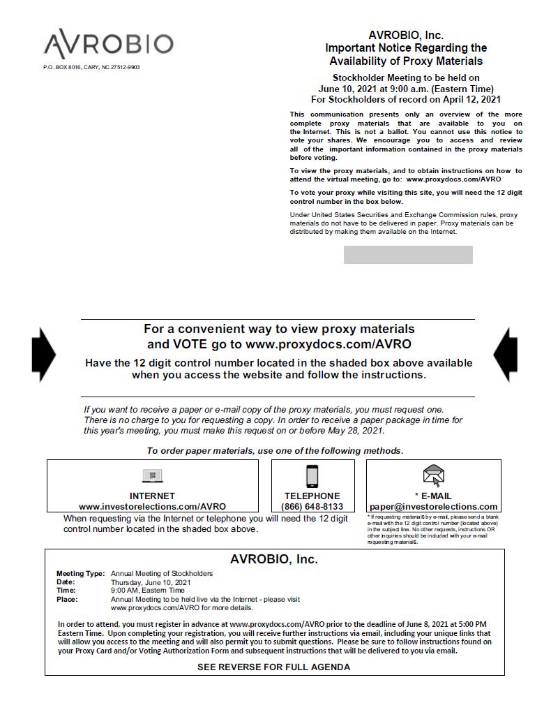 AVROBIO P.O. BOX 8016, CARY, NC 27512-9903 AVROBIO, Inc. Important Notice Regarding the Availability of Proxy Materials Stockholder Meeting to be held on June 10, 2021 at 9:00 a.m. (Eastern Time) For Stockholders of record on April 12, 2021 This communication presents only an overview of the more complete proxy materials that are available to you on the Internet. This is not a ballot. You cannot use this notice to vote your shares. We encourage you to access and review all of the important information contained in the proxy materials before voting. To view the proxy materials, and to obtain instructions on how to attend the virtual meeting, go to: www.proxydocs.com/AVRO To vote your proxy while visiting this site, you will need the 12 digit control number in the box below. Under United States Securities and Exchange Commission rules, proxy materials do not have to be delivered in paper. Proxy materials can be distributed by making them available on the Internet. For a convenient way to view proxy materials and VOTE go to www.proxydocs.com/AVRO Have the 12 digit control number located in the shaded box above available when you access the website and follow the instructions. If you want to receive a paper or e-mail copy of the proxy materials, you must request one. There is no charge to you for requesting a copy. In order to receive a paper package in time for this year's meeting, you must make this request on or before May 28, 2021. To order paper materials, use one of the following methods. INTERNET www.investorelections.com/AVRO TELEPHONE (866) 648-8133 * E-MAIL paper@investorelections.com When requesting via the Internet or telephone you will need the 12 digit control number located in the shaded box above. * If requesting materials by e-mail, please send a blank e-mail with the 12 digit control number (located above) in the subject line. No other requests, instructions OR other inquiries should be included with your e-mail requesting materials. AVROBIO, Inc. Meeting Type: Date: Time: Place: Annual Meeting of Stockholders Thursday, June 10, 2021 9:00 AM, Eastern Time Annual Meeting to be held live via the Internet - please visit www.proxydocs.com/AVRO for more details. In order to attend, you must register in advance at www.proxydocs.com/AVRO prior to the deadline of June 8, 2021 at 5:00 PM Eastern Time. Upon completing your registration, you will receive further instructions via email, including your unique links that will allow you access to the meeting and will also permit you to submit questions. Please be sure to follow instructions found on your Proxy Card and/or Voting Authorization Form and subsequent instructions that will be delivered to you via email. SEE REVERSE FOR FULL AGENDA