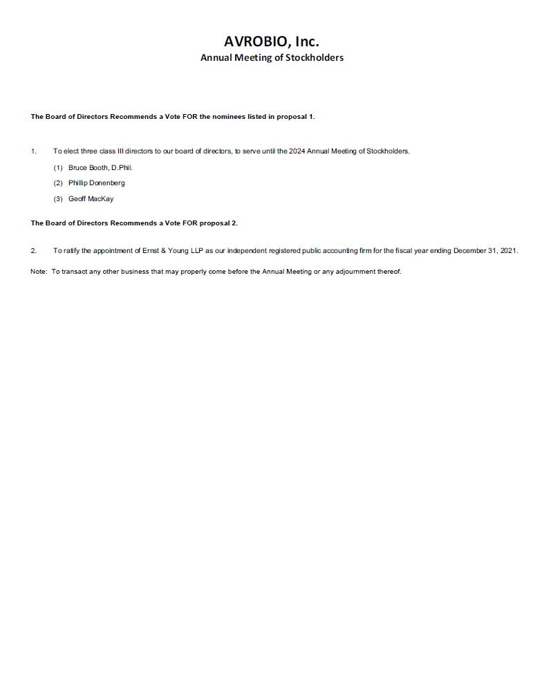 AVROBIO, Inc. Annual Meeting of Stockholders The Board of Directors Recommends a Vote FOR the nominees listed in proposal 1. 1. To elect three class III directors to our board of directors, to serve until the 2024 Annual Meeting of Stockholders. (1) Bruce Booth, D.Phil. (2) Phillip Donenberg (3) Geoff MacKay The Board of Directors Recommends a Vote FOR proposal 2. 2. To ratify the appointment of Ernst & Young LLP as our independent registered public accounting firm for the fiscal year ending December 31, 2021. Note: To transact any other business that may properly come before the Annual Meeting or any adjournment thereof.