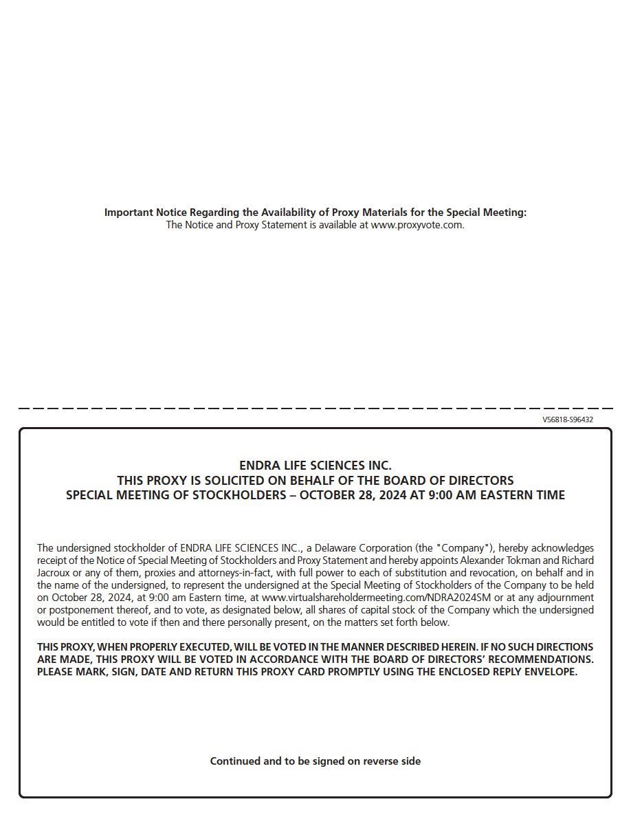 NOTICE IS HEREBY GIVEN that the Special Meeting of Stockholders of ENDRA Life Sciences Inc., a Delaware corporation, will take place on October 28, 2024 at 9:00 a.m., Eastern Time and any adjournments or postponements thereof. The Special Meeting will be a virtual meeting, held on the internet at www.virtualshareholdermeeting.com/NDRA2024SM, for the following purposes: