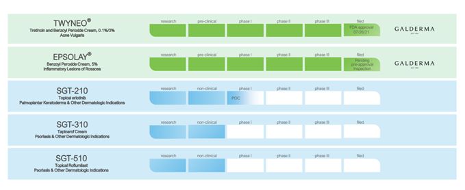 the treatment of papulopustular (subtype II) rosacea; “SGT-210” refers to SGT-210 (erlotinib), under investigation for the