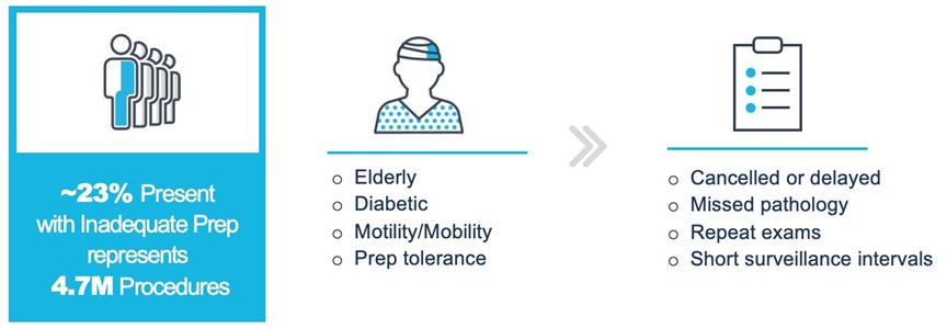 Despite the pervasiveness and effectiveness of endoscopy, it can lead to failed, delayed and poor quality procedures especially in the inpatient setting. Rescheduling the procedure creates inefficiencies in the provider’s workflow, and increases the length of hospital stay, each of which results in increased healthcare costs. In GI bleeding, diagnosing the treating the source of the bleed can be critical to the patients outcome, especially in upper GI bleeding which has a mortality rate of 10%. For colonoscope in the inpatient setting the preparation regimen typically requires patients to be on a liquid diet for 24 hours, drink up to four liters of a purgative, spend up to 12 hours prior to the exam periodically going to the bathroom to empty their bowels, which can be difficult for frail patients in the hospital. For inpatients, approximately 51% have inadequate preparation that leads to at least one extra night in the hospital according to a published study by the Cleveland Clinic.