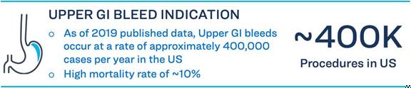 Upper GI bleeds occurred in the U.S. at a rate of approximately 400,000 cases per year in 2019, according to iData Research Inc. Approximately 50% of these patients have blood and blood clots that impair a physician’s view during the procedure, thereby making it difficult to rapidly identify the bleeding source. We believe removing adherent blood clots from the field of view is a significant need in allowing a physician the ability to identify and treat the bleed source. The mortality rate of this condition can reach up to approximately 13%, as noted in Thad Wilkins, MD, et al., American Family Physician (2012).