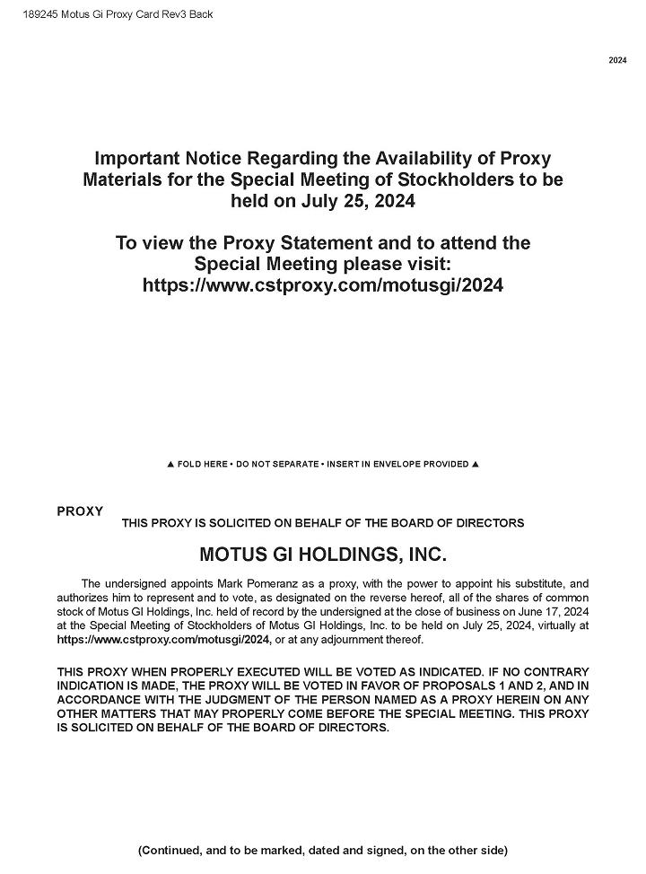 This proxy statement contains information related to the Special Meeting of Stockholders (the “Special Meeting”) to be held on July 25, 2024 at 9:30 a.m. eastern time, or at such other time and place to which the Special Meeting may be adjourned or postponed. We are planning to hold the Special Meeting virtually via the Internet, at https://www.cstproxy.com/motusgi/2024. The enclosed proxy is solicited by the Board of Directors (the “Board”) of Motus GI Holdings, Inc. (the “Company”). The proxy materials relating to the Special Meeting will first be made available to stockholders entitled to vote at the Special Meeting on or about June , 2024. A list of record holders of the Company’s common stock entitled to vote at the Special Meeting will be available for examination by any stockholder, for any purpose germane to the Special Meeting, at our principal offices located at 1301 East Broward Boulevard, 3rd Floor, Ft. Lauderdale, FL 33301, during normal business hours for ten days prior to the Special Meeting and during the Special Meeting.