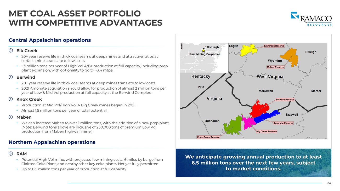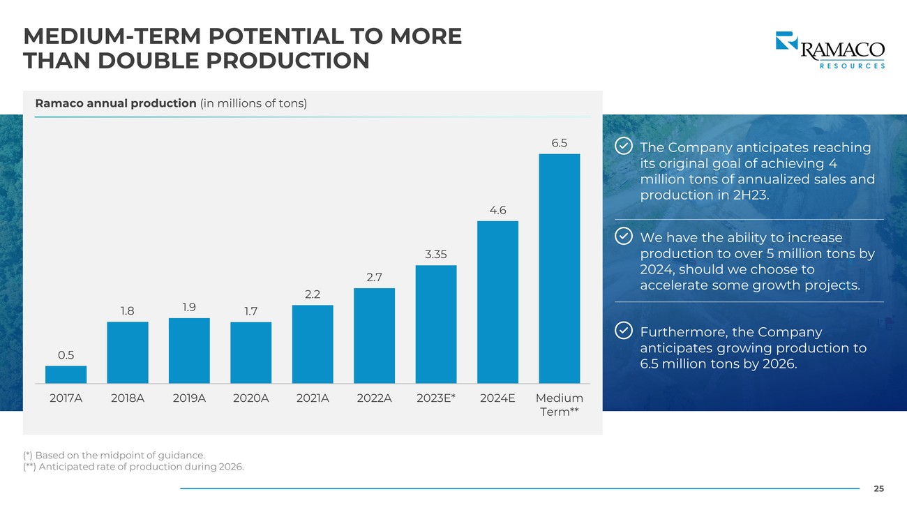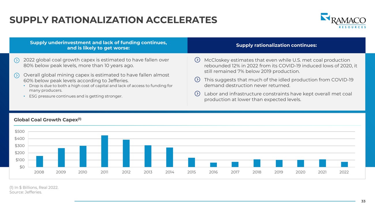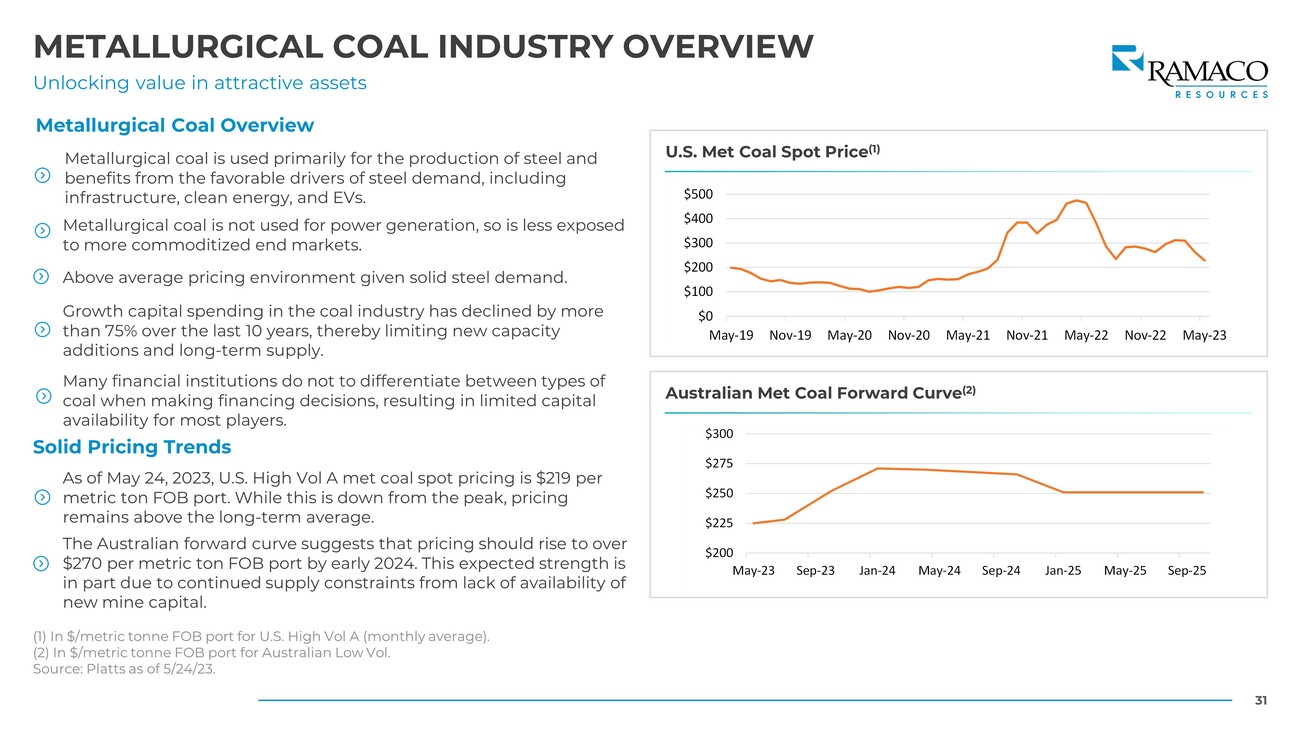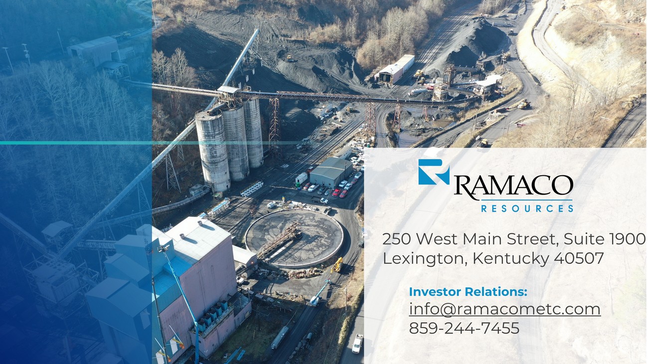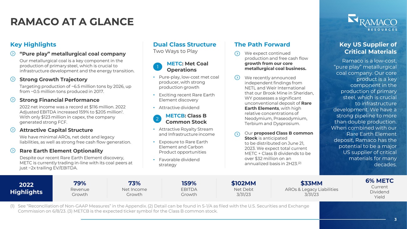 DISCLAIMER Forward Looking Statements: The information in this presentation includes “forward - looking statements” within the meaning of Section 27A of the Securities Act of 1933, as amended (the “Securities Act”) and Section 21E of the Securities Exchange Act of 1934, as amended (the “Exchange Act”). All statements, other than statements of historical fact included in this presentation, regarding our strate gy, future operations, financial position, estimated revenue and losses, projected costs, prospects, plans and objectives of management are forward - looking statements. When used in this presentation, the words “could,” “believe,” “anticipate,” “intend,” “estimate,” “expect,” “project” and similar expressions are intended to identify forward - looking statements, although not all forward - looking statements contain such identifying words. These forward - looking statements are based on management’s current expectations and assumptions about future events and are based on currently available information as to the outcome and timing of future events. When considering forward - looking statements, you should keep in mind the risk factors and other cautionary statements described under, but not limited to, the headings Item 1A, “Risk Factors” and “ Cautionary Note Regarding Forward - Looking Statements” included in our Annual Report on Form 10 - K for the year ended December 31, 2022, our Quarterly Report on Form 10 - Q for the period ended March 31, 2023, our form of prospectus included as part of the Registration Statement on Form S - 1/A filed with the SEC on April 7, 2023 related to the Class B common stock, and in any of our subsequent filings with the SEC. Forward - looking statements may include statements about: • risks related to the impact of the novel coronavirus (“COVID - 19”) global pandemic, such as the scope and duration of the outbreak, the health and safety of our employees, government actions and restrictive measures implemented in response, delays and cancellations of customer sales, supply chain disruptions and other impacts to the business, or our ability to execute our business continuity plans; • anticipated production levels, costs, sales volumes and revenue; • timing and ability to complete major capital projects; • economic conditions in the metallurgical coal and steel industries generally, including any near - term or long - term downturn in these industries as a result of the COVID - 19 global pandemic and related actions; • expected costs to develop planned and future mining operations, including the costs to construct necessary processing, refuse disposal and transport facilities; • estimated quantities or quality of our metallurgical coal reserves; • our ability to obtain additional financing on favorable terms, if required, to complete the acquisition of additional metallurgical coal reserves as currently contemplated or to fund the operations and growth of our business; • maintenance, operating or other expenses or changes in the timing thereof; • the financial condition and liquidity of our customers; • competition in coal markets; • the price of metallurgical coal or thermal coal; • compliance with stringent domestic and foreign laws and regulations, including environmental, climate change and health and safety regulations, and permitting requirements, as well as changes in the regulatory environment, the adoption of new or revised laws, regulations and permitting requirements; • potential legal proceedings and regulatory inquiries against us; • the impact of weather and natural disasters on demand, production and transportation; • purchases by major customers and our ability to renew sales contracts; • credit and performance risks associated with customers, suppliers, contract miners, co - shippers and traders, banks and other financial counterparties; • geologic, equipment, permitting, site access and operational risks and new technologies related to mining; • transportation availability, performance and costs; • availability, timing of delivery and costs of key supplies, capital equipment or commodities such as diesel fuel, steel, explosives and tires; • timely review and approval of permits, permit renewals, extensions and amendments by regulatory authorities; • our ability to comply with certain debt covenants; • tax payments to be paid for the current fiscal year; • our expectations relating to dividend payments and our ability to make such payments; • the anticipated benefits and impacts of the Ramaco Coal, LLC (“Ramaco Coal”) and Maben acquisitions; • risks related to Russia’s invasion of Ukraine and the international community’s response; • risks related to weakened global economic conditions and inflation; and • other risks identified in this presentation that are not historical. We caution you that these forward - looking statements are subject to a number of risks, uncertainties and assumptions, which are difficult to predict and many of which are beyond our control, incident to the development, production, gathering and sal e of coal. Moreover, we operate in a very competitive and rapidly changing environment and additional risks may arise from time to time. It is not possible for our management to predict all of the risks associated with our business, including those desc rib ed under the heading “Risk Factors” included in Ramaco’s Annual Report on Form 10 - K, nor can we assess the impact of all factors on our business or the extent to which any factor, or combination of factors, may cause actual results to differ materially f rom those contained in any forward - looking statements we may make. Although we believe that our plans, intentions and expectations reflected in or suggested by the forward - looking statements we make in this presentation are reasonable, we can give no assurance that these plans, intentions
