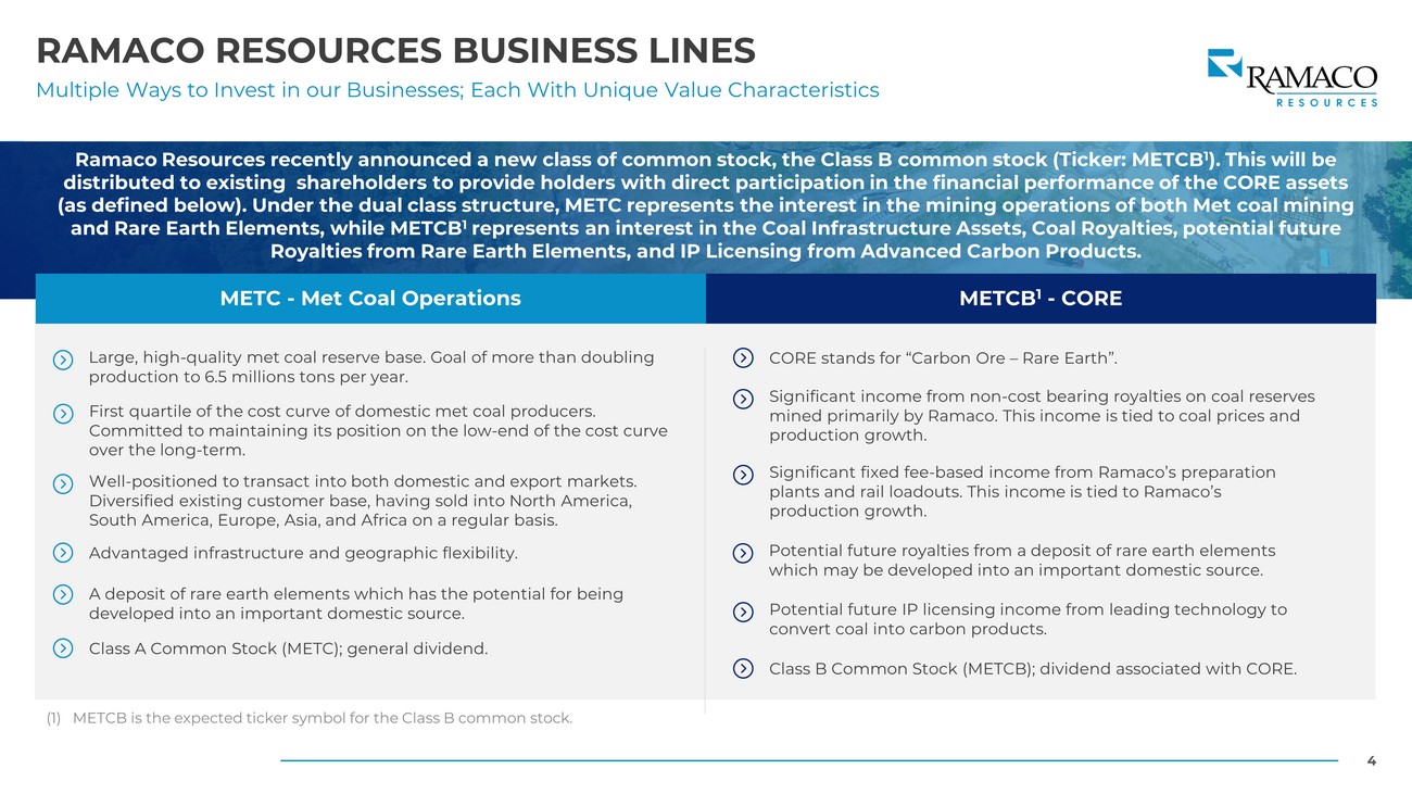 3 RAMACO AT A GLANCE (1) See “Reconciliation of Non - GAAP Measures” in the Appendix. (2) Detail can be found in S - 1/A as filed with the U.S. Securities an d Exchange Commission on 6/8/23. (3) METCB is the expected ticker symbol for the Class B common stock. Key US Supplier of Critical Materials Ramaco is a low - cost, “pure play” metallurgical coal company. Our core product is a key component in the production of primary steel, which is crucial to infrastructure development. We have a strong pipeline to more than double production. When combined with our Rare Earth Element deposit, Ramaco has the potential to be a major US supplier of critical materials for many decades. 3 2022 Highlights 79% Revenue Growth 73% Net Income Growth 159% EBITDA Growth $102MM Net Debt 3/31/23 $33MM AROs & Legacy Liabilities 3/31/23 6% METC Current Dividend Yield Key Highlights Dual Class Structure Two Ways to Play • Pure - play, low - cost met coal producer, with strong production growth • Exciting recent Rare Earth Element discovery • Attractive dividend 1 METC : Met Coal Operations • Attractive Royalty Stream and Infrastructure income • Exposure to Rare Earth Element and Carbon Product opportunities • Favorable dividend strategy 2 METCB : Class B Common Stock “Pure play” metallurgical coal company Our metallurgical coal is a key component in the production of primary steel, which is crucial to infrastructure development and the energy transition. Strong Growth Trajectory Targeting production of ~6.5 million tons by 2026, up from ~0.5 million tons produced in 2017. Strong Financial Performance 2022 net income was a record at $116 million. 2022 Adjusted EBITDA increased 159% to $205 million 1 . With only $123 million in capex, the company generated strong FCF. Attractive Capital Structure We have minimal AROs, net debt and legacy liabilities, as well as strong free cash flow generation. Rare Earth Element Optionality Despite our recent Rare Earth Element discovery, METC is currently trading in - line with its coal peers at just ~2x trailing EV/EBITDA. The Path Forward We expect continued production and free cash flow growth from our core metallurgical coal business. We recently announced independent findings from NETL and Weir International that our Brook Mine in Sheridan, WY possesses a significant unconventional deposit of Rare Earth Elements , with high relative concentrations of Neodymium, Praseodymium, Terbium and Dysprosium. Our proposed Class B common Stock is anticipated to be distributed on June 21, 2023. We expect total current METC + Class B dividends to be over $32 million on an annualized basis in 2H23. (2)