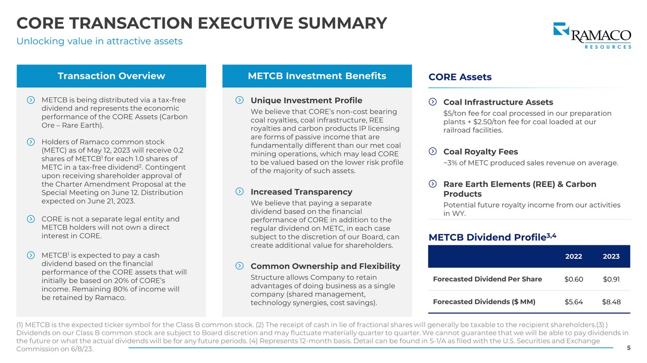 4 RAMACO RESOURCES BUSINESS LINES Multiple Ways to Invest in our Businesses; Each With Unique Value Characteristics METC - Met Coal Operations METCB 1 - CORE Large, high - quality met coal reserve base. Goal of more than doubling production to 6.5 millions tons per year. First quartile of the cost curve of domestic met coal producers. Committed to maintaining its position on the low - end of the cost curve over the long - term. Well - positioned to transact into both domestic and export markets. Diversified existing customer base, having sold into North America, South America, Europe, Asia, and Africa on a regular basis. Advantaged infrastructure and geographic flexibility. A deposit of rare earth elements which has the potential for being developed into an important domestic source. Significant income from non - cost bearing royalties on coal reserves mined primarily by Ramaco. This income is tied to coal prices and production growth. Significant fixed fee - based income from Ramaco’s preparation plants and rail loadouts. This income is tied to Ramaco’s production growth. Potential future royalties from a deposit of rare earth elements which may be developed into an important domestic source. Potential future IP licensing income from leading technology to convert coal into carbon products. Class B Common Stock (METCB); dividend associated with CORE. Ramaco Resources recently announced a new class of common stock, the Class B common stock (Ticker: METCB 1 ). This will be distributed to existing shareholders to provide holders with direct participation in the financial performance of the CORE a sse ts (as defined below). Under the dual class structure, METC represents the interest in the mining operations of both Met coal mi nin g and Rare Earth Elements, while METCB 1 represents an interest in the Coal Infrastructure Assets, Coal Royalties, potential future Royalties from Rare Earth Elements, and IP Licensing from Advanced Carbon Products. Class A Common Stock (METC); general dividend. CORE stands for “Carbon Ore – Rare Earth”. (1) METCB is the expected ticker symbol for the Class B common stock.