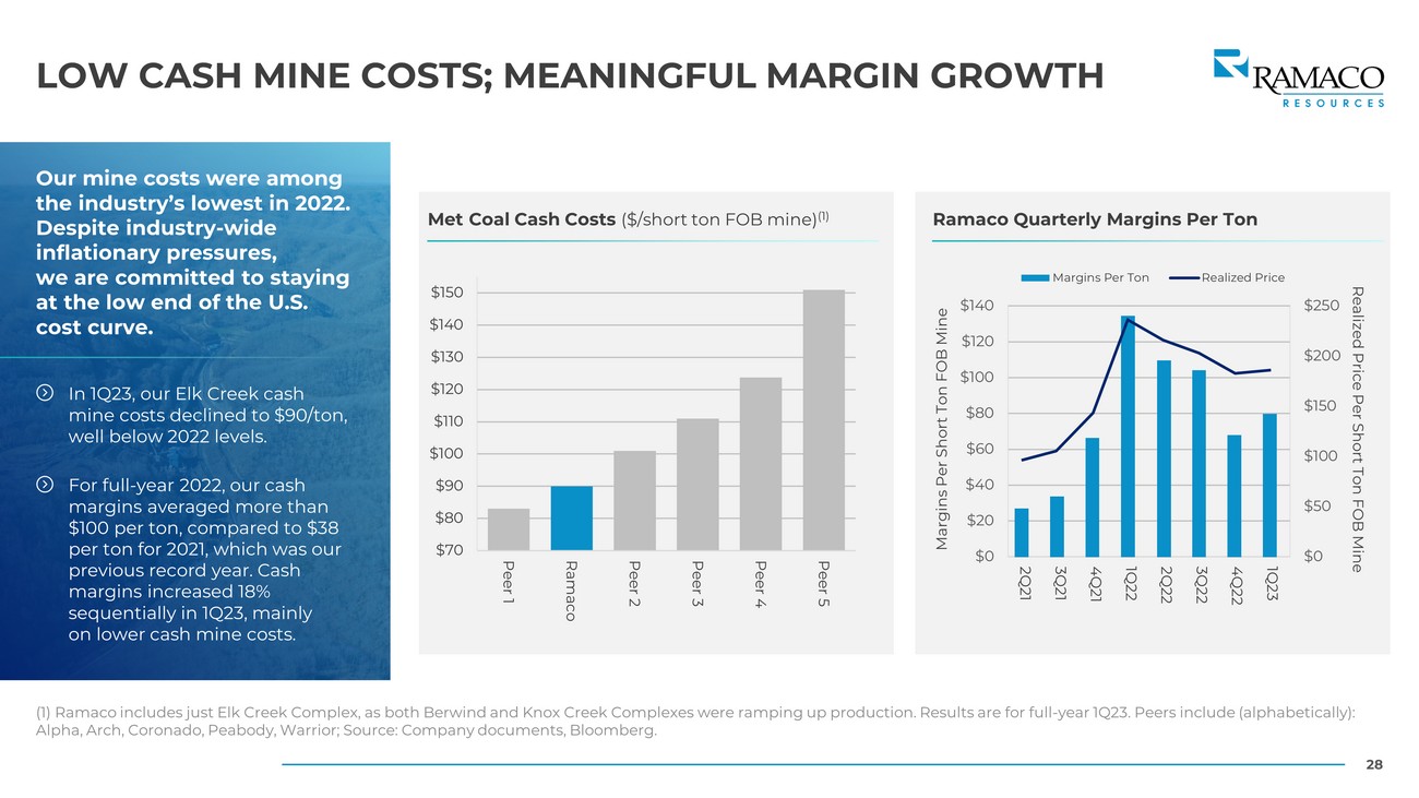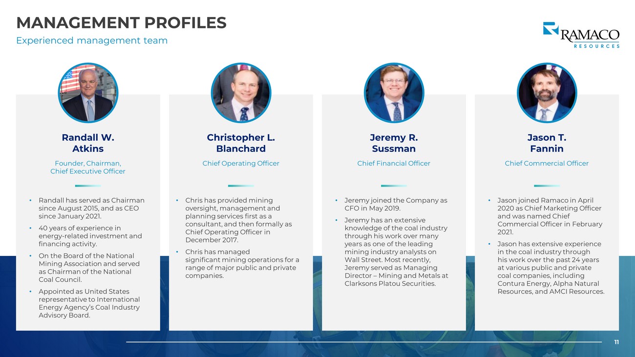 10 SOLID START TO 2023 Strong execution during first quarter positions Ramaco well for its long - term goals 1Q23 4Q22 Change vs 4Q 1Q22 Change YoY Total Tons Sold (000) 757 675 12% 583 30% Revenue ($MM) $166 $135 23% $155 7% Cost of Sales ($MM) $111 $95 16% $81 36% Pricing of Company Produced Tons ($/Ton) $185 $182 2% $234 (21%) Cash Cost of Sales - Company Produced ($/Ton)* $105 $114 (8%) $106 (1%) Cash Margins on Company Produced ($/Ton) $80 $68 18% $128 (38%) Net Income ($MM) $25 $14 76% $42 (39%) Diluted Earnings per Share $0.57 $0.32 75% $0.92 (39%) Adjusted EBITDA ($MM) $48 $32 51% $64 (25%) Capital Expenditures ($MM) $24 $32 (26%) $20 19% Adjusted EBITDA less Capex ($MM) $25 $0 7985% $44 (44%) (*) Adjusted to include the royalty savings from the Ramaco Coal transaction 1Q22. Excludes Berwind idle costs in 1Q23 and 4Q 22. Cash costs and margins are non - GAAP measures. Strong 1Q23 execution led to record coal production and tons sold, as well as lower Non - GAAP cash cost of sales. First quarter production was a record 834,000 tons and tons sold of 757,000 was up 30% YoY, on the back of the Company’s continued strong growth pipeline. Non - GAAP cash cost of sales was $105 per ton during 1Q23, down from $114 per ton during 4Q22. First quarter net income of $25 million (diluted EPS of $0.57) and Adjusted EBITDA of $48 million were 76% and 51% respectively above fourth quarter of 2022 results. First quarter net income and Adjusted EBITDA were negatively affected by $2 million and $3 million respectively from Berwind idle costs.