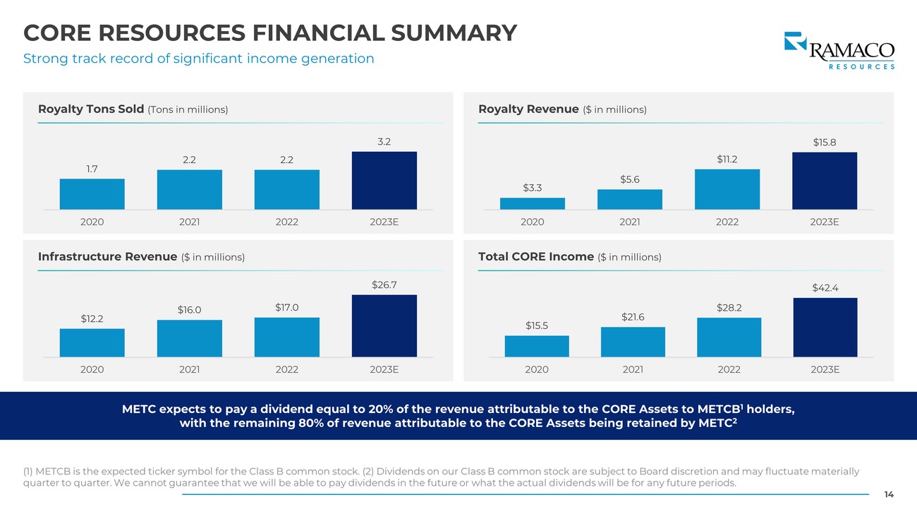 13 CORE ASSETS OVERVIEW Coal production and infrastructure royalty business; potential future royalties on REEs and advance carbon products (1) METCB is the expected ticker symbol for the Class B common stock. (2) Represents 12 - month basis. Detail can be found in S - 1/A as filed with the U.S. Securities and Exchange Commission on 6/8/23. CORE Assets represents the coal royalty and coal infrastructure assets of Ramaco, as well as potential future royalties from Ramaco’s rare earth element deposit and advanced carbon products business. Holders of METCB 1 will receive a separate dividend based on the financial performance of the CORE Assets. 13 Significant income from non - cost bearing royalties on coal reserves mined primarily by Ramaco. CORE Assets Investment Highlights Significant fixed fee - based income from coal preparation plants and rail loadout facilities all servicing Ramaco. Potential future royalties from a deposit of rare earth elements which has the potential for being developed into an important domestic source of REEs. Potential future licensing fees from a vertically integrated platform consisting of leading - edge technology to convert coal into high value advanced carbon products. Current forecast assumes a CORE dividend of $0.60 per share in 2022 ($5.6 million) and $0.91 per share ($8.5 million) in 2023 2 . CORE Assets Portfolio Overview Coal Royalties • Non cost bearing royalty interests in coal assets owned in - fee or under long - term leases, the vast majority of which are operated by Ramaco. • ~37% of CORE’s projected 2023 income. Coal Infrastructure • Non cost bearing: $5/ton fee for coal processed in Ramaco’s preparation plants + $2.50/ton fee for coal loaded at Ramaco’s railroad facilities. • ~63% of CORE’s projected 2023 income. Rare Earth Elements • Large Exploration Target was recently defined by Weir International, which suggests the Brook Mine could become a valuable source of domestic REEs. • Potential future royalty income. Advanced Carbon Products • Vertically integrated platform of resource, research, and future manufacturing assets focused on advanced - carbon product technologies. • Potential future licensing fee income.
