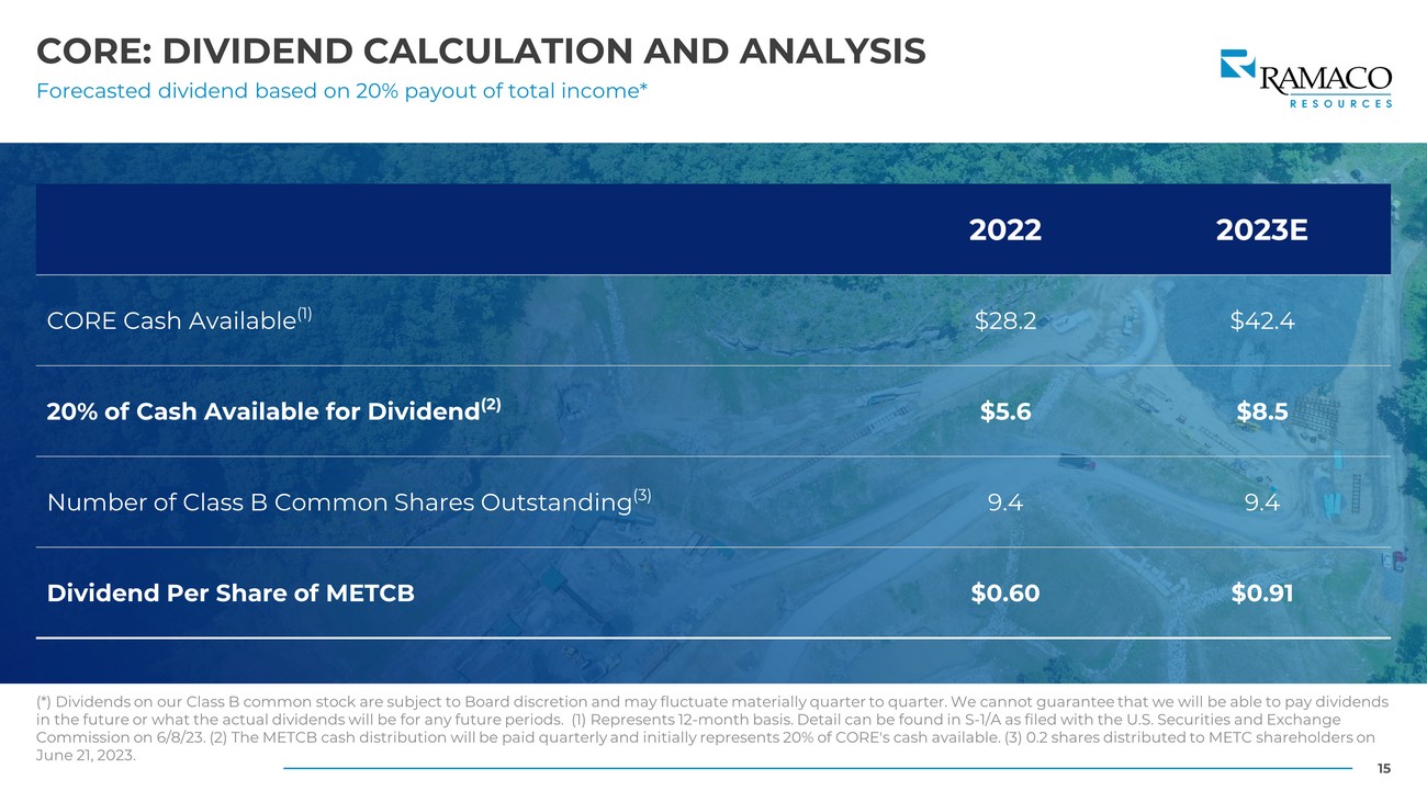 14 CORE RESOURCES FINANCIAL SUMMARY Strong track record of significant income generation METC expects to pay a dividend equal to 20% of the revenue attributable to the CORE Assets to METCB 1 holders, with the remaining 80% of revenue attributable to the CORE Assets being retained by METC 2 Total CORE Income ($ in millions) Infrastructure Revenue ($ in millions) Royalty Revenue ($ in millions) Royalty Tons Sold (Tons in millions) (1) METCB is the expected ticker symbol for the Class B common stock. (2) Dividends on our Class B common stock are subject t o B oard discretion and may fluctuate materially quarter to quarter. We cannot guarantee that we will be able to pay dividends in the future or what the actual dividends will be for any future periods. 1.7 2.2 2.2 3.2 2020 2021 2022 2023E $3.3 $5.6 $11.2 $15.8 2020 2021 2022 2023E $12.2 $16.0 $17.0 $26.7 2020 2021 2022 2023E $15.5 $21.6 $28.2 $42.4 2020 2021 2022 2023E