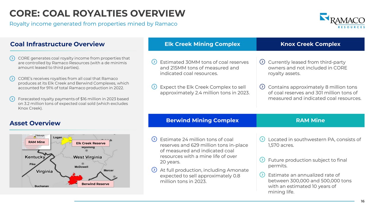 15 CORE: DIVIDEND CALCULATION AND ANALYSIS Forecasted dividend based on 20% payout of total income* (*) Dividends on our Class B common stock are subject to Board discretion and may fluctuate materially quarter to quarter. We ca nnot guarantee that we will be able to pay dividends in the future or what the actual dividends will be for any future periods. (1) Represents 12 - month basis. Detail can be found i n S - 1/A as filed with the U.S. Securities and Exchange Commission on 6/8/23. (2) The METCB cash distribution will be paid quarterly and initially represents 20% of CORE's cash avai lab le. (3) 0.2 shares distributed to METC shareholders on June 21, 2023. 2022 2023E CORE Cash Available (1) $28.2 $42.4 20% of Cash Available for Dividend (2) $5.6 $8.5 Number of Class B Common Shares Outstanding (3) 9.4 9.4 Dividend Per Share of METCB $0.60 $0.91