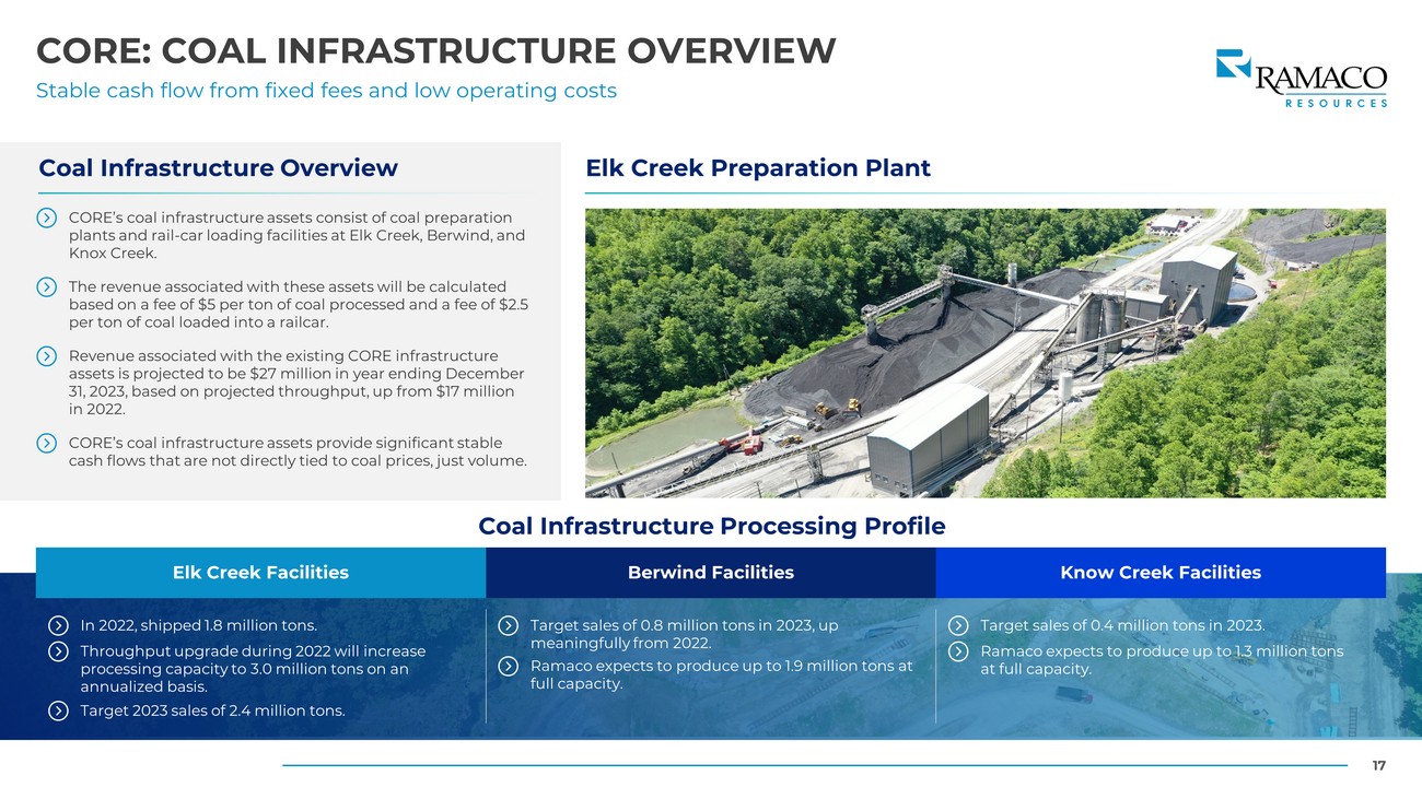 16 CORE: COAL ROYALTIES OVERVIEW Royalty income generated from properties mined by Ramaco CORE generates coal royalty income from properties that are controlled by Ramaco Resources (with a de minimis amount leased to third parties). Asset Overview Coal Infrastructure Overview RAM Mine Elk Creek Reserve Berwind Reserve CORE’s receives royalties from all coal that Ramaco produces at its Elk Creek and Berwind Complexes, which accounted for 91% of total Ramaco production in 2022. Forecasted royalty payments of $16 million in 2023 based on 3.2 million tons of expected coal sold (which excludes Knox Creek). Estimated 30MM tons of coal reserves and 215MM tons of measured and indicated coal resources. Elk Creek Mining Complex Knox Creek Complex Expect the Elk Creek Complex to sell approximately 2.4 million tons in 2023. Currently leased from third - party owners and not included in CORE royalty assets. Contains approximately 8 million tons of coal reserves and 301 million tons of measured and indicated coal resources. Estimate 24 million tons of coal reserves and 629 million tons in - place of measured and indicated coal resources with a mine life of over 20 years. Berwind Mining Complex RAM Mine Located in southwestern PA, consists of 1,570 acres. Future production subject to final permits. At full production, including Amonate expected to sell approximately 0.8 million tons in 2023. Estimate an annualized rate of between 300,000 and 500,000 tons with an estimated 10 years of mining life.