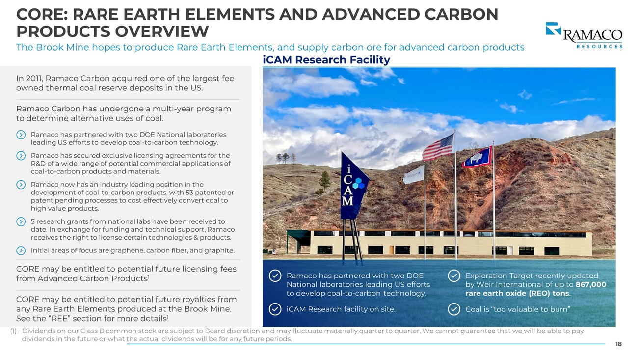 18 CORE: RARE EARTH ELEMENTS AND ADVANCED CARBON PRODUCTS OVERVIEW The Brook Mine hopes to produce Rare Earth Elements, and supply carbon ore for advanced carbon products In 2011, Ramaco Carbon acquired one of the largest fee owned thermal coal reserve deposits in the US. Ramaco Carbon has undergone a multi - year program to determine alternative uses of coal. Ramaco has partnered with two DOE National laboratories leading US efforts to develop coal - to - carbon technology. Ramaco has secured exclusive licensing agreements for the R&D of a wide range of potential commercial applications of coal - to - carbon products and materials. Ramaco now has an industry leading position in the development of coal - to - carbon products, with 53 patented or patent pending processes to cost effectively convert coal to high value products. 5 research grants from national labs have been received to date. In exchange for funding and technical support, Ramaco receives the right to license certain technologies & products. Initial areas of focus are graphene, carbon fiber, and graphite. CORE may be entitled to potential future licensing fees from Advanced Carbon Products 1 CORE may be entitled to potential future royalties from any Rare Earth Elements produced at the Brook Mine. See the “REE” section for more details 1 Ramaco has partnered with two DOE National laboratories leading US efforts to develop coal - to - carbon technology. Exploration Target recently updated by Weir International of up to 867,000 rare earth oxide (REO) tons . iCAM Research facility on site. iCAM Research Facility Coal is “too valuable to burn” (1) Dividends on our Class B common stock are subject to Board discretion and may fluctuate materially quarter to quarter. We can not guarantee that we will be able to pay dividends in the future or what the actual dividends will be for any future periods.