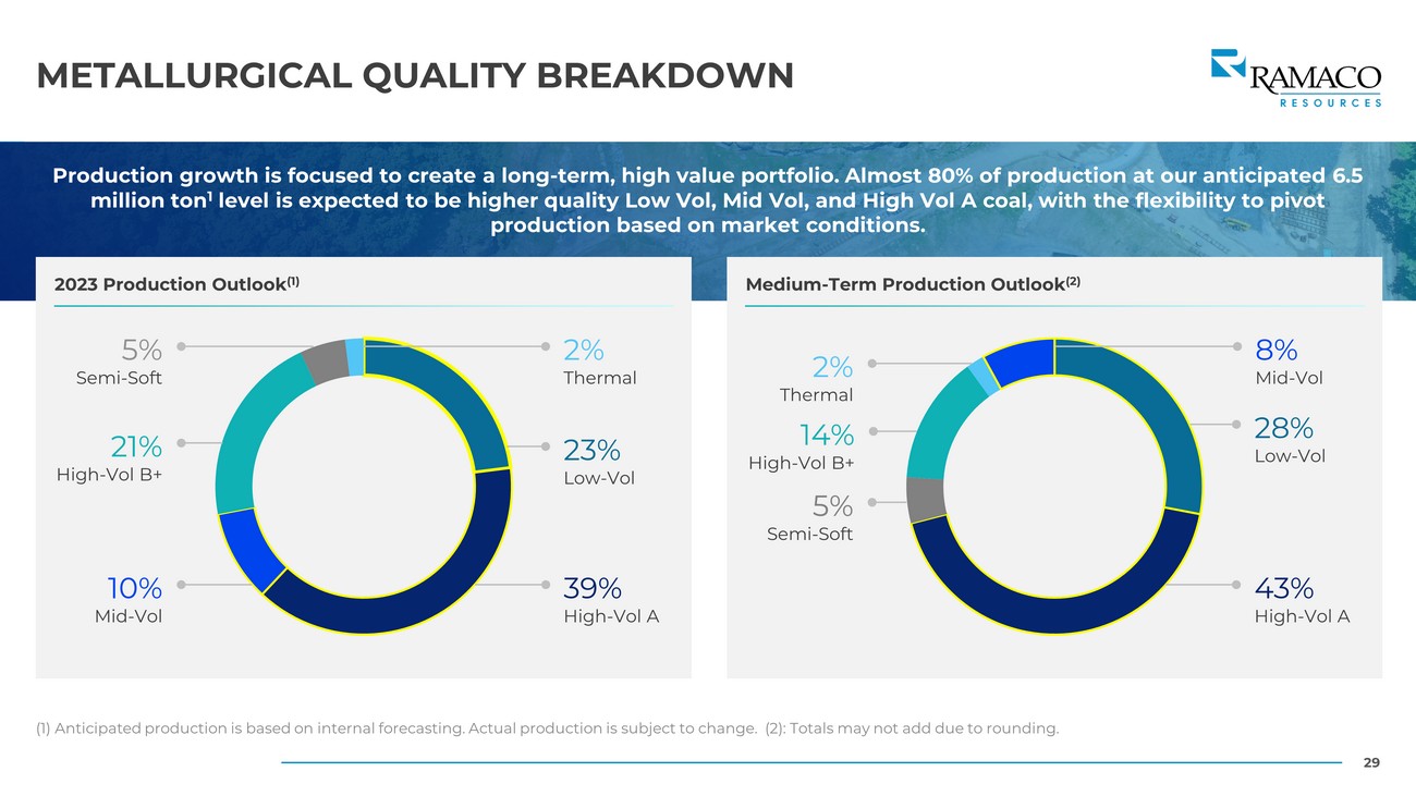 28 LOW CASH MINE COSTS; MEANINGFUL MARGIN GROWTH (1) Ramaco includes just Elk Creek Complex, as both Berwind and Knox Creek Complexes were ramping up production. Results are for full - year 1Q23. Peers include (alphabetically): Alpha, Arch, Coronado, Peabody, Warrior; Source: Company documents, Bloomberg. Our mine costs were among the industry’s lowest in 2022. Despite industry - wide inflationary pressures, we are committed to staying at the low end of the U.S. cost curve. Ramaco Quarterly Margins Per Ton In 1Q23, our Elk Creek cash mine costs declined to $90/ton, well below 2022 levels. For full - year 2022, our cash margins averaged more than $100 per ton, compared to $38 per ton for 2021, which was our previous record year. Cash margins increased 18% sequentially in 1Q23, mainly on lower cash mine costs. Met Coal Cash Costs ($/short ton FOB mine) (1) $70 $80 $90 $100 $110 $120 $130 $140 $150 Peer 1 Ramaco Peer 2 Peer 3 Peer 4 Peer 5 $0 $50 $100 $150 $200 $250 $0 $20 $40 $60 $80 $100 $120 $140 2Q21 3Q21 4Q21 1Q22 2Q22 3Q22 4Q22 1Q23 Margins Per Ton Realized Price Margins Per Short Ton FOB Mine Realized Price Per Short Ton FOB Mine