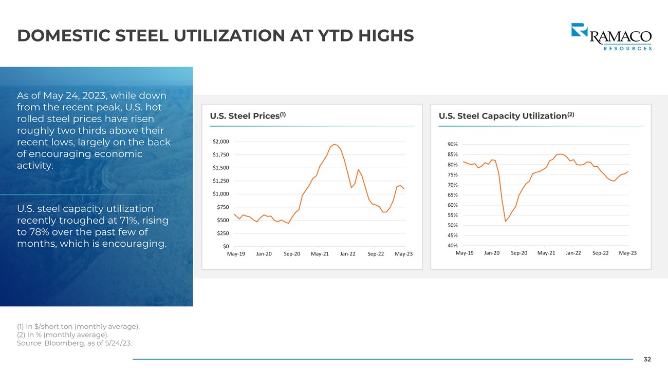 31 METALLURGICAL COAL INDUSTRY OVERVIEW Unlocking value in attractive assets (1) In $/metric tonne FOB port for U.S. High Vol A (monthly average). (2) In $/metric tonne FOB port for Australian Low Vol. Source: Platts as of 5/24/23. Metallurgical Coal Overview Metallurgical coal is used primarily for the production of steel and benefits from the favorable drivers of steel demand, including infrastructure, clean energy, and EVs. Metallurgical coal is not used for power generation, so is less exposed to more commoditized end markets. Above average pricing environment given solid steel demand. Growth capital spending in the coal industry has declined by more than 75% over the last 10 years, thereby limiting new capacity additions and long - term supply. Many financial institutions do not to differentiate between types of coal when making financing decisions, resulting in limited capital availability for most players. Solid Pricing Trends As of May 24, 2023, U.S. High Vol A met coal spot pricing is $219 per metric ton FOB port. While this is down from the peak, pricing remains above the long - term average. The Australian forward curve suggests that pricing should rise to over $270 per metric ton FOB port by early 2024. This expected strength is in part due to continued supply constraints from lack of availability of new mine capital. U.S. Met Coal Spot Price (1) Australian Met Coal Forward Curve (2) $200 $225 $250 $275 $300 May-23 Sep-23 Jan-24 May-24 Sep-24 Jan-25 May-25 Sep-25 $0 $100 $200 $300 $400 $500 May-19 Nov-19 May-20 Nov-20 May-21 Nov-21 May-22 Nov-22 May-23