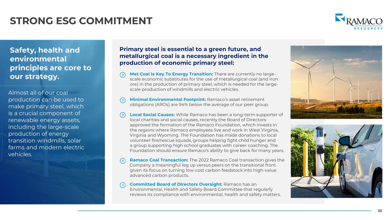 35 STRONG ESG COMMITMENT Safety, health and environmental principles are core to our strategy. Almost all of our coal production can be used to make primary steel, which is a crucial component of renewable energy assets, including the large - scale production of energy transition windmills, solar farms and modern electric vehicles. Primary steel is essential to a green future, and metallurgical coal is a necessary ingredient in the production of economic primary steel: Met Coal Is Key To Energy Transition: There are currently no large - scale economic substitutes for the use of metallurgical coal (and iron ore) in the production of primary steel, which is needed for the large - scale production of windmills and electric vehicles. Minimal Environmental Footprint: Ramaco’s asset retirement obligations (AROs) are 94% below the average of our peer group. Local Social Causes: While Ramaco has been a long - term supporter of local charities and social causes, recently the Board of Directors approved the formation of the Ramaco Foundation, which invests in the regions where Ramaco employees live and work in West Virginia, Virginia and Wyoming. The Foundation has made donations to local volunteer fire/rescue squads, groups helping fight child hunger and a group supporting high school graduates with career coaching. The Foundation should ensure Ramaco’s ability to give back for many years. Ramaco Coal Transaction: The 2022 Ramaco Coal transaction gives the Company a meaningful leg up versus peers on the transitional front given its focus on turning low - cost carbon feedstock into high - value advanced carbon products. Committed Board of Directors Oversight: Ramaco has an Environmental, Health and Safety Board Committee that regularly reviews its compliance with environmental, health and safety matters.