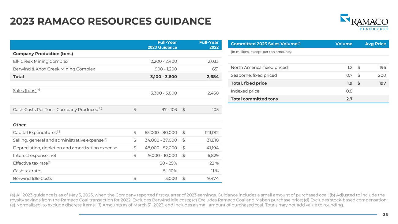 38 2023 RAMACO RESOURCES GUIDANCE (a) All 2023 guidance is as of May 3, 2023, when the Company reported first quarter of 2023 earnings. Guidance includes a sma ll amount of purchased coal; (b) Adjusted to include the royalty savings from the Ramaco Coal transaction for 2022. Excludes Berwind idle costs; (c) Excludes Ramaco Coal and Maben pu rch ase price; (d) Excludes stock - based compensation; (e) Normalized, to exclude discrete items.; (f) Amounts as of March 31, 2023, and includes a small amount of purchased coal. Tot als may not add value to rounding. Full - Year 2023 Guidance Full - Year 2022 Company Production (tons) Elk Creek Mining Complex 2,200 - 2,400 2,033 Berwind & Knox Creek Mining Complex 900 - 1,200 651 Total 3,100 - 3,600 2,684 Sales (tons) (a) 3,300 - 3,800 2,450 Cash Costs Per Ton - Company Produced (b) $ 97 - 103 $ 105 Other Capital Expenditures (c) $ 65,000 - 80,000 $ 123,012 Selling, general and administrative expense (d) $ 34,000 - 37,000 $ 31,810 Depreciation, depletion and amortization expense $ 48,000 - 52,000 $ 41,194 Interest expense, net $ 9,000 - 10,000 $ 6,829 Effective tax rate (e) 20 - 25% 22 % Cash tax rate 5 - 10% 11 % Berwind Idle Costs $ 3,000 $ 9,474 Committed 2023 Sales Volume (f) Volume Avg Price (In millions, except per ton amounts) North America, fixed priced 1.2 $ 196 Seaborne, fixed priced 0.7 $ 200 Total, fixed price 1.9 $ 197 Indexed price 0.8 Total committed tons 2.7