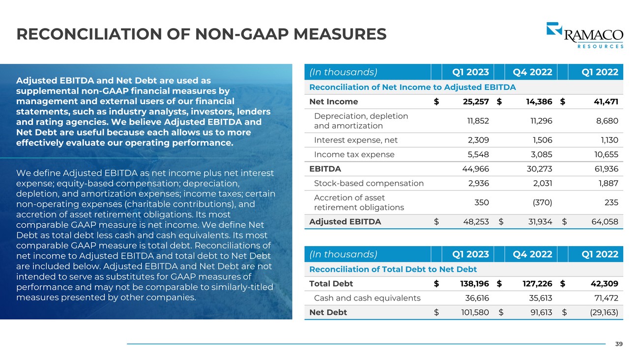 39 RECONCILIATION OF NON - GAAP MEASURES Adjusted EBITDA and Net Debt are used as supplemental non - GAAP financial measures by management and external users of our financial statements, such as industry analysts, investors, lenders and rating agencies. We believe Adjusted EBITDA and Net Debt are useful because each allows us to more effectively evaluate our operating performance. We define Adjusted EBITDA as net income plus net interest expense; equity - based compensation; depreciation, depletion, and amortization expenses; income taxes; certain non - operating expenses (charitable contributions), and accretion of asset retirement obligations. Its most comparable GAAP measure is net income. We define Net Debt as total debt less cash and cash equivalents. Its most comparable GAAP measure is total debt. Reconciliations of net income to Adjusted EBITDA and total debt to Net Debt are included below. Adjusted EBITDA and Net Debt are not intended to serve as substitutes for GAAP measures of performance and may not be comparable to similarly - titled measures presented by other companies. (In thousands) Q1 2023 Q4 2022 Q1 2022 Reconciliation of Net Income to Adjusted EBITDA Net Income $ 25,257 $ 14,386 $ 41,471 Depreciation, depletion and amortization 11,852 11,296 8,680 Interest expense, net 2,309 1,506 1,130 Income tax expense 5,548 3,085 10,655 EBITDA 44,966 30,273 61,936 Stock - based compensation 2,936 2,031 1,887 Accretion of asset retirement obligations 350 (370) 235 Adjusted EBITDA $ 48,253 $ 31,934 $ 64,058 (In thousands) Q1 2023 Q4 2022 Q1 2022 Reconciliation of Total Debt to Net Debt Total Debt $ 138,196 $ 127,226 $ 42,309 Cash and cash equivalents 36,616 35,613 71,472 Net Debt $ 101,580 $ 91,613 $ (29,163)