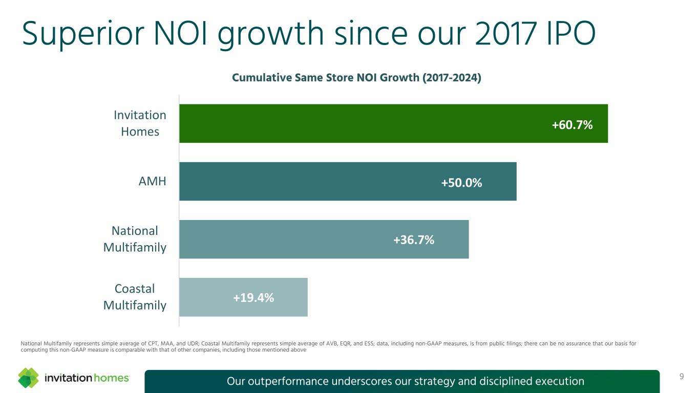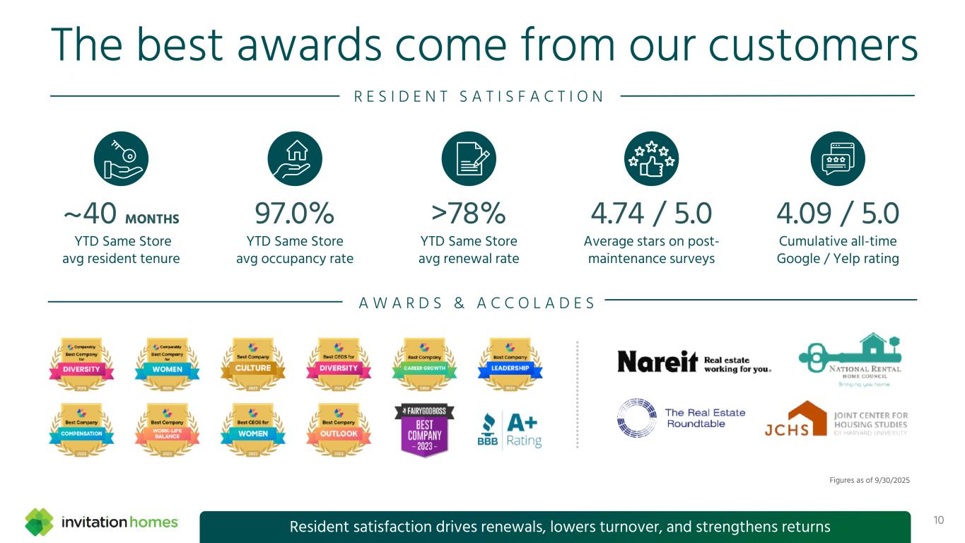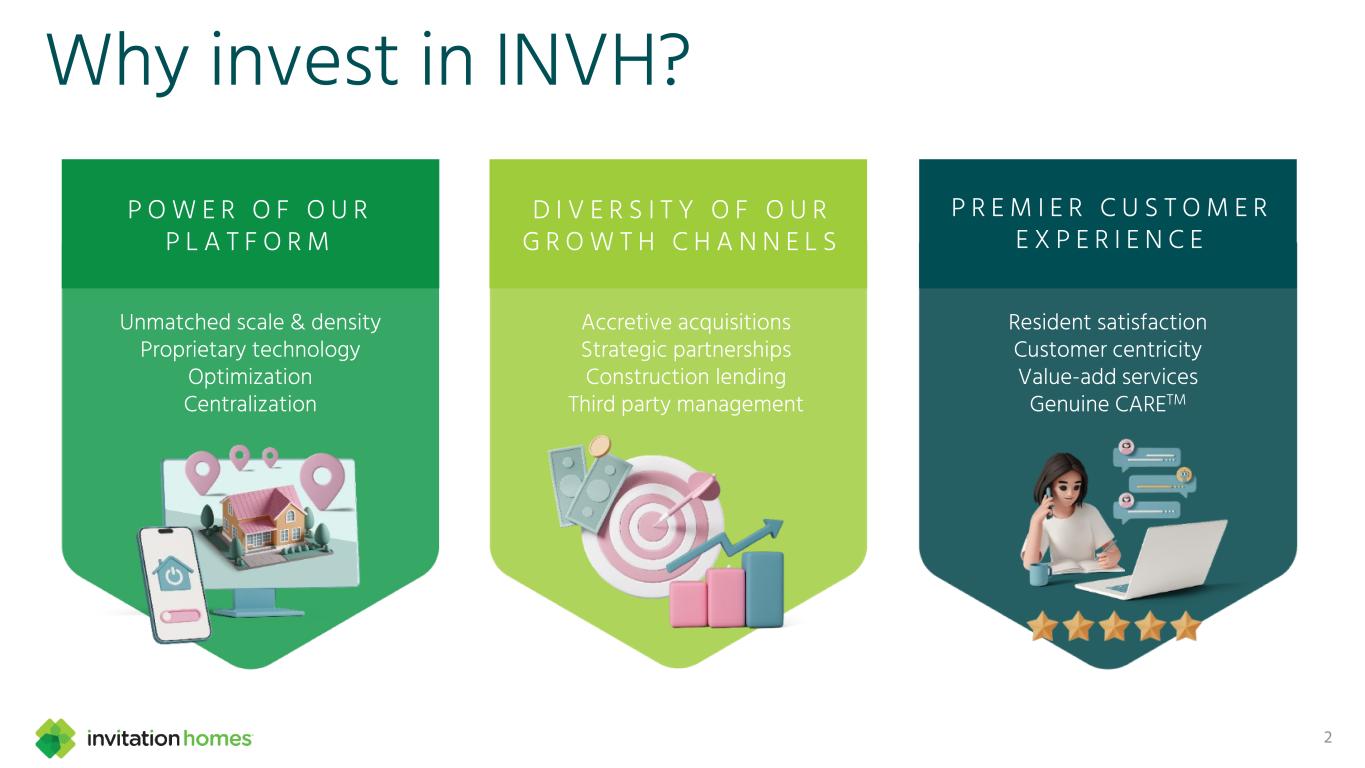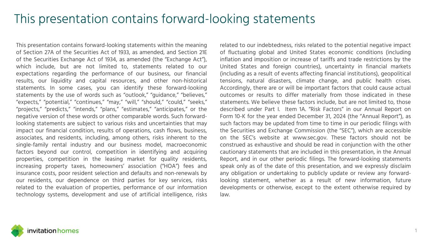 This presentation contains forward-looking statements This presentation contains forward-looking statements within the meaning of Section 27A of the Securities Act of 1933, as amended, and Section 21E of the Securities Exchange Act of 1934, as amended (the “Exchange Act”), which include, but are not limited to, statements related to our expectations regarding the performance of our business, our financial results, our liquidity and capital resources, and other non-historical statements. In some cases, you can identify these forward-looking statements by the use of words such as “outlook,” “guidance,” “believes,” “expects,” “potential,” “continues,” “may,” “will,” “should,” “could,” “seeks,” “projects,” “predicts,” “intends,” “plans,” “estimates,” “anticipates,” or the negative version of these words or other comparable words. Such forward- looking statements are subject to various risks and uncertainties that may impact our financial condition, results of operations, cash flows, business, associates, and residents, including, among others, risks inherent to the single-family rental industry and our business model, macroeconomic factors beyond our control, competition in identifying and acquiring properties, competition in the leasing market for quality residents, increasing property taxes, homeowners’ association (“HOA”) fees and insurance costs, poor resident selection and defaults and non-renewals by our residents, our dependence on third parties for key services, risks related to the evaluation of properties, performance of our information technology systems, development and use of artificial intelligence, risks related to our indebtedness, risks related to the potential negative impact of fluctuating global and United States economic conditions (including inflation and imposition or increase of tariffs and trade restrictions by the United States and foreign countries), uncertainty in financial markets (including as a result of events affecting financial institutions), geopolitical tensions, natural disasters, climate change, and public health crises. Accordingly, there are or will be important factors that could cause actual outcomes or results to differ materially from those indicated in these statements. We believe these factors include, but are not limited to, those described under Part I. Item 1A. “Risk Factors” in our Annual Report on Form 10-K for the year ended December 31, 2024 (the “Annual Report”), as such factors may be updated from time to time in our periodic filings with the Securities and Exchange Commission (the “SEC”), which are accessible on the SEC’s website at www.sec.gov. These factors should not be construed as exhaustive and should be read in conjunction with the other cautionary statements that are included in this presentation, in the Annual Report, and in our other periodic filings. The forward-looking statements speak only as of the date of this presentation, and we expressly disclaim any obligation or undertaking to publicly update or review any forward- looking statement, whether as a result of new information, future developments or otherwise, except to the extent otherwise required by law. 1