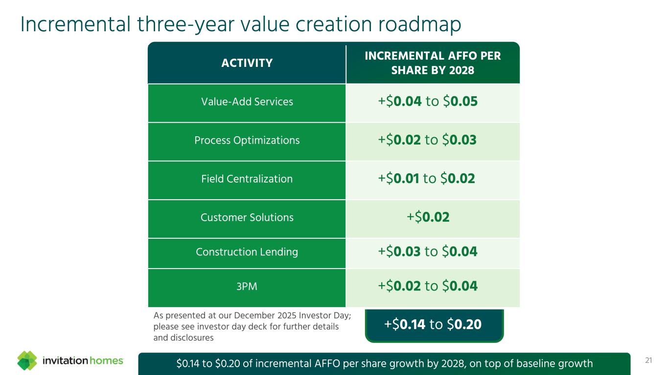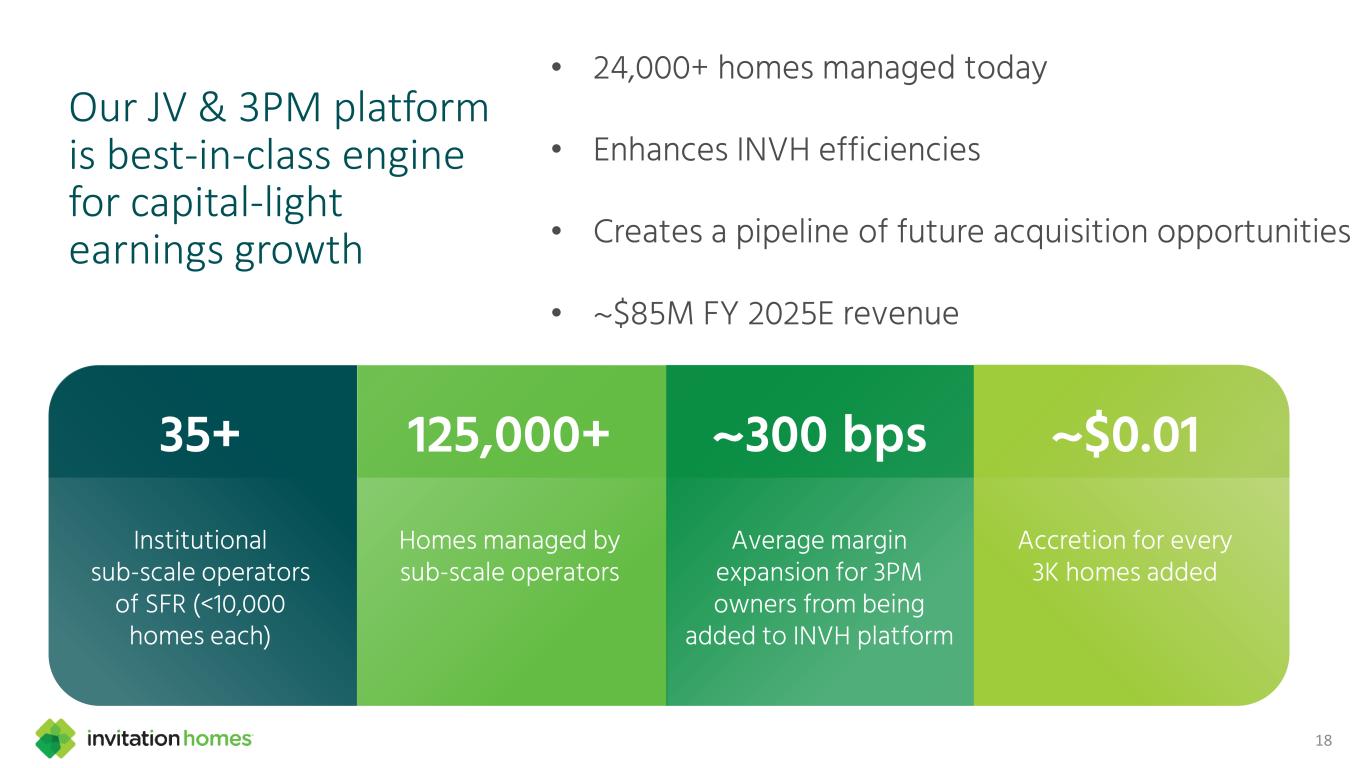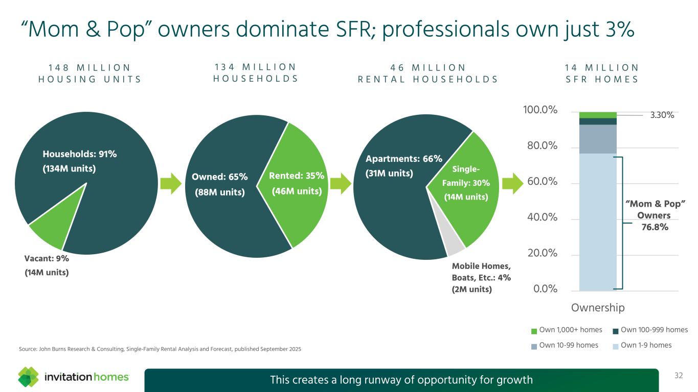 This creates a long runway of opportunity for growth Source: John Burns Research & Consulting, Single-Family Rental Analysis and Forecast, published September 2025 3.30% 0.0% 20.0% 40.0% 60.0% 80.0% 100.0% Ownership Own 1,000+ homes Own 100-999 homes Own 10-99 homes Own 1-9 homes 4 6 M I L L I O N R E N T A L H O U S E H O L D S Single- Family: 30% (14M units) Owned: 65% (88M units) Rented: 35% (46M units) 1 3 4 M I L L I O N H O U S E H O L D S Vacant: 9% (14M units) 1 4 8 M I L L I O N H O U S I N G U N I T S “Mom & Pop” Owners 76.8% 1 4 M I L L I O N S F R H O M E S “Mom & Pop” owners dominate SFR; professionals own just 3% Mobile Homes, Boats, Etc.: 4% (2M units) Households: 91% (134M units) Apartments: 66% (31M units) 32