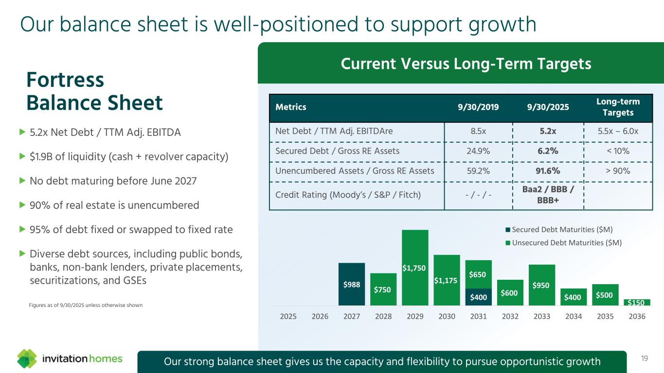 18 ~300 bps Average margin expansion for 3PM owners from being added to INVH platform 35+ Institutional sub-scale operators of SFR (<10,000 homes each) 125,000+ Homes managed by sub-scale operators ~$0.01 Accretion for every 3K homes added • 24,000+ homes managed today • Enhances INVH efficiencies • Creates a pipeline of future acquisition opportunities • ~$85M FY 2025E revenue Our JV & 3PM platform is best-in-class engine for capital-light earnings growth