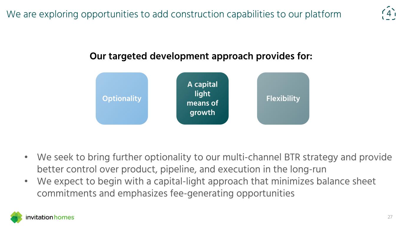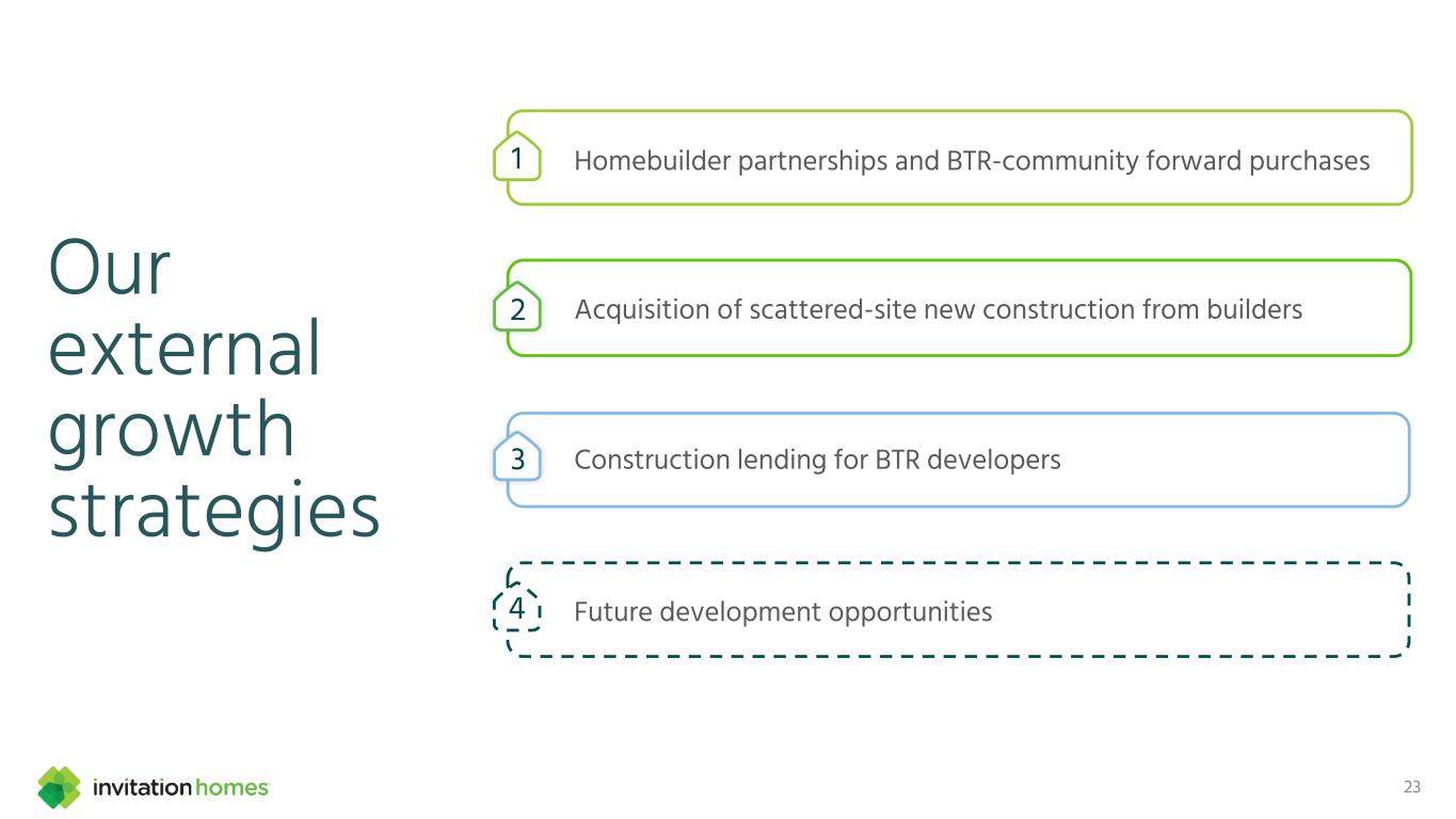 Our external growth strategies Acquisition of scattered-site new construction from builders Homebuilder partnerships and BTR-community forward purchases Construction lending for BTR developers 23 Future development opportunities 1 2 3 4