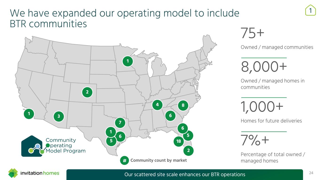 75+ Owned / managed communities 8,000+ Owned / managed homes in communities 1,000+ Homes for future deliveries 7%+ Percentage of total owned / managed homes 24 Community count by market# Our scattered site scale enhances our BTR operations 1 2 3 1 7 6 5 1 6 84 5 6 2 18 1We have expanded our operating model to include BTR communities