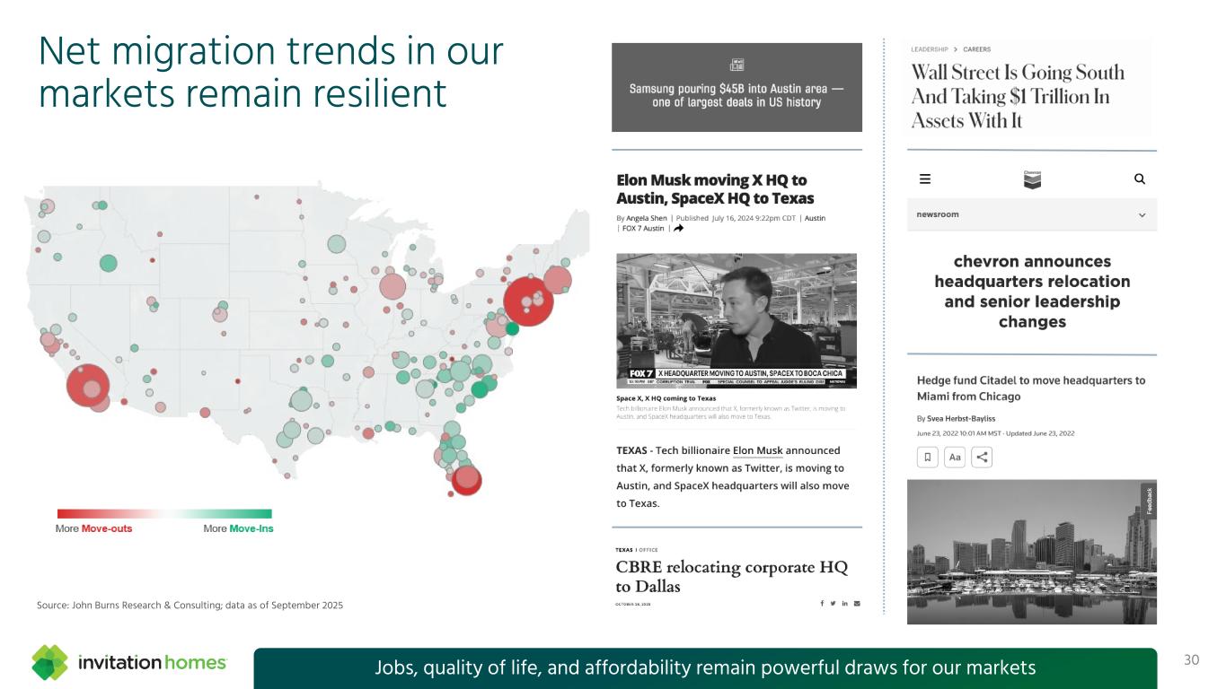 Millennials & Gen Z fuel long-term demand for single-family rentals 29Over 13k people expected to turn age 35 every day over the next 10 years -3M -2M -1M 0M 1M 2M 3M 4M Age 0–4 Age 5–9 Age 10–14 Age 15–19 Age 20–24 Age 25–29 Age 30–34 Age 35–39 Age 40–44 Age 45–49 Age 50–54 Age 55–59 Age 60–64 Age 65–69 U.S. 10-Year Net Population Change by Age Group (2025-2034) I N V H S W E E T S P O T Average age of new resident: 39 years Source: John Burns Research & Consulting, tabulations of U.S. Census Bureau Population Estimates and the Congressional Budget Office Projections, published September 2025
