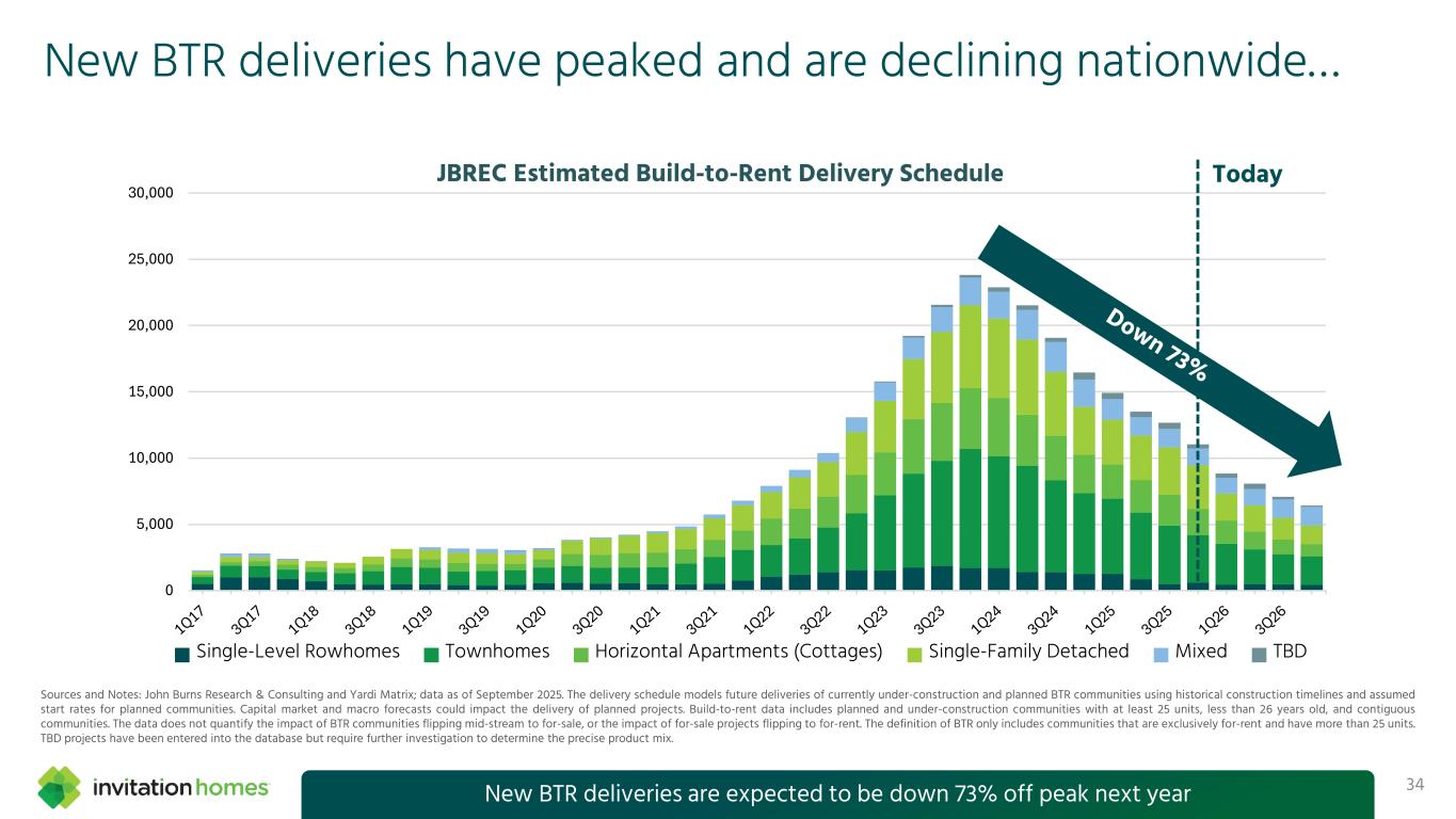 The U.S. remains undersupplied by as many as 2 to 4 million homes Total Housing Permits (Single and Multifamily) as a % of Households in Invitation Homes’ Markets 0.0% 1.0% 2.0% 3.0% 4.0% 1980 1984 1988 1992 1996 2000 2004 2008 2012 2016 2020 2024 Single-Family Multifamily '80-'25 Avg Source: U.S. Census Bureau and John Burns Research & Consulting; data as of June 2025 33Near-term supply pockets exist, but structural undersupply drives long-term demand