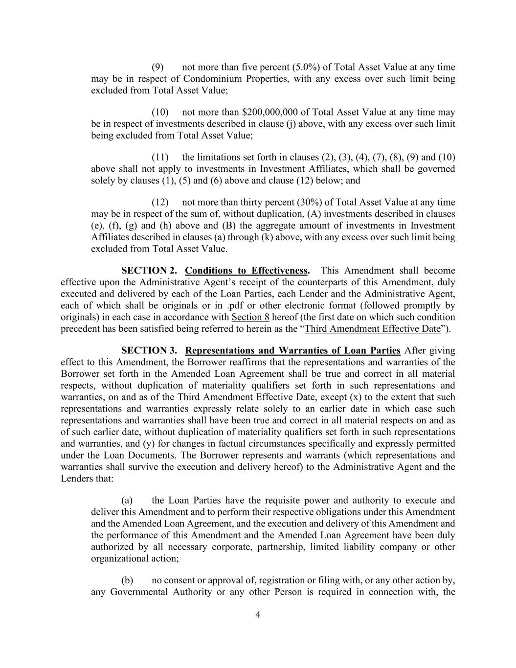 4 (9) not more than five percent (5.0%) of Total Asset Value at any time may be in respect of Condominium Properties, with any excess over such limit being excluded from Total Asset Value; (10) not more than $200,000,000 of Total Asset Value at any time may be in respect of investments described in clause (j) above, with any excess over such limit being excluded from Total Asset Value; (11) the limitations set forth in clauses (2), (3), (4), (7), (8), (9) and (10) above shall not apply to investments in Investment Affiliates, which shall be governed solely by clauses (1), (5) and (6) above and clause (12) below; and (12) not more than thirty percent (30%) of Total Asset Value at any time may be in respect of the sum of, without duplication, (A) investments described in clauses (e), (f), (g) and (h) above and (B) the aggregate amount of investments in Investment Affiliates described in clauses (a) through (k) above, with any excess over such limit being excluded from Total Asset Value. SECTION 2. Conditions to Effectiveness. This Amendment shall become effective upon the Administrative Agent’s receipt of the counterparts of this Amendment, duly executed and delivered by each of the Loan Parties, each Lender and the Administrative Agent, each of which shall be originals or in .pdf or other electronic format (followed promptly by originals) in each case in accordance with Section 8 hereof (the first date on which such condition precedent has been satisfied being referred to herein as the “Third Amendment Effective Date”). SECTION 3. Representations and Warranties of Loan Parties After giving effect to this Amendment, the Borrower reaffirms that the representations and warranties of the Borrower set forth in the Amended Loan Agreement shall be true and correct in all material respects, without duplication of materiality qualifiers set forth in such representations and warranties, on and as of the Third Amendment Effective Date, except (x) to the extent that such representations and warranties expressly relate solely to an earlier date in which case such representations and warranties shall have been true and correct in all material respects on and as of such earlier date, without duplication of materiality qualifiers set forth in such representations and warranties, and (y) for changes in factual circumstances specifically and expressly permitted under the Loan Documents. The Borrower represents and warrants (which representations and warranties shall survive the execution and delivery hereof) to the Administrative Agent and the Lenders that: (a) the Loan Parties have the requisite power and authority to execute and deliver this Amendment and to perform their respective obligations under this Amendment and the Amended Loan Agreement, and the execution and delivery of this Amendment and the performance of this Amendment and the Amended Loan Agreement have been duly authorized by all necessary corporate, partnership, limited liability company or other organizational action; (b) no consent or approval of, registration or filing with, or any other action by, any Governmental Authority or any other Person is required in connection with, the