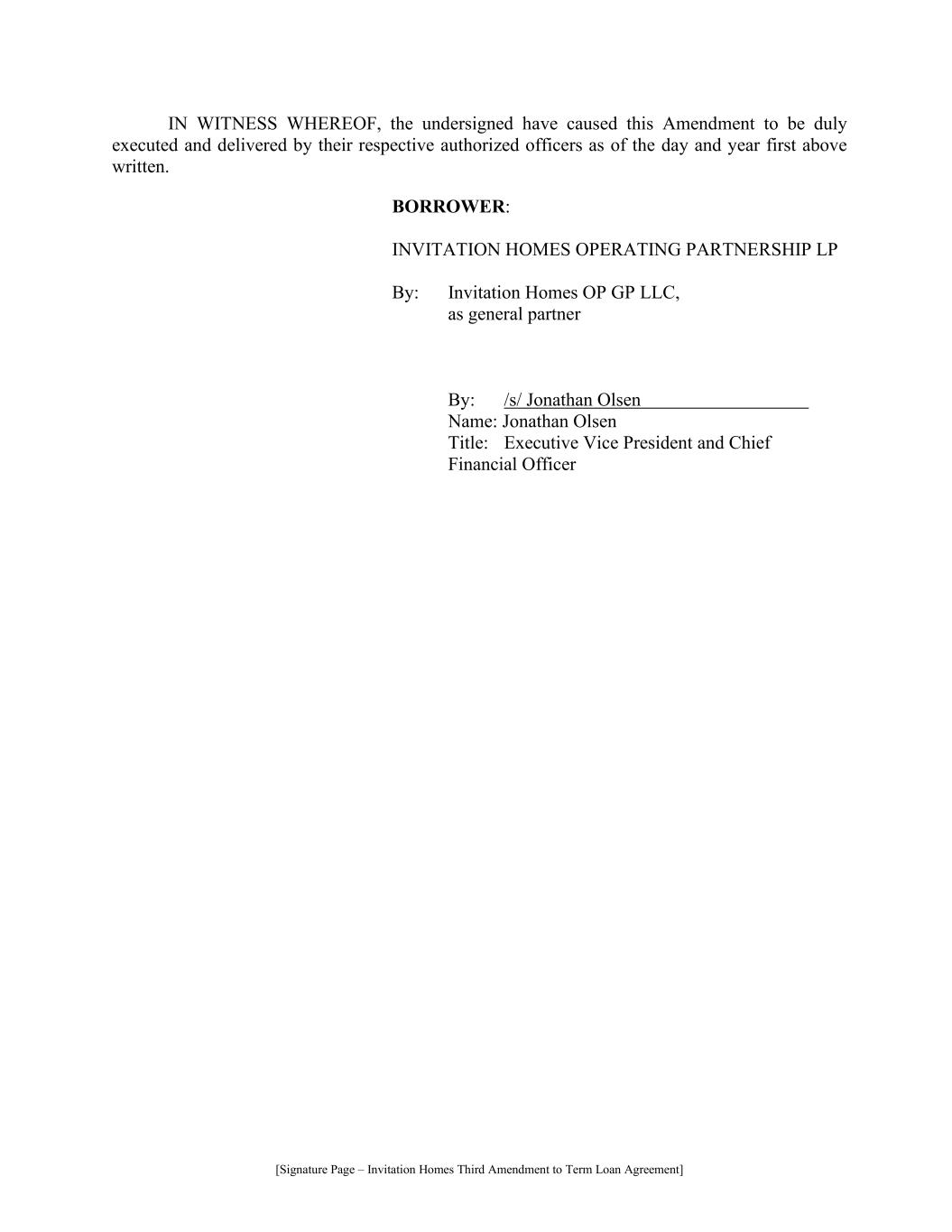 [Signature Page – Invitation Homes Third Amendment to Term Loan Agreement] IN WITNESS WHEREOF, the undersigned have caused this Amendment to be duly executed and delivered by their respective authorized officers as of the day and year first above written. BORROWER: INVITATION HOMES OPERATING PARTNERSHIP LP By: Invitation Homes OP GP LLC, as general partner By: /s/ Jonathan Olsen……………………… Name: Jonathan Olsen Title: Executive Vice President and Chief Financial Officer