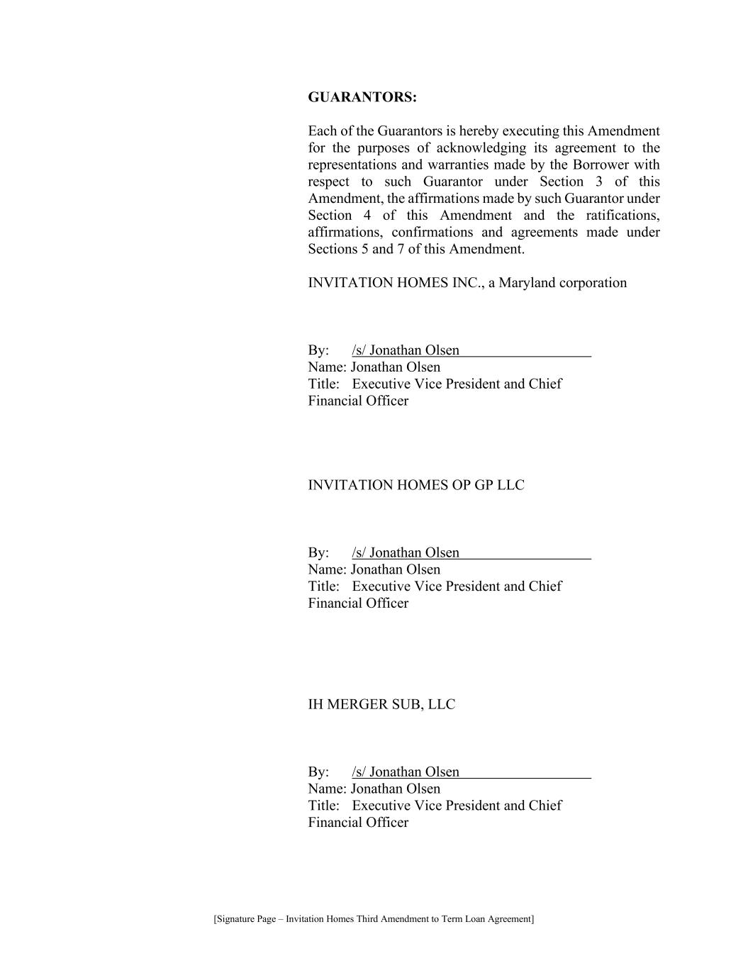 [Signature Page – Invitation Homes Third Amendment to Term Loan Agreement] GUARANTORS: Each of the Guarantors is hereby executing this Amendment for the purposes of acknowledging its agreement to the representations and warranties made by the Borrower with respect to such Guarantor under Section 3 of this Amendment, the affirmations made by such Guarantor under Section 4 of this Amendment and the ratifications, affirmations, confirmations and agreements made under Sections 5 and 7 of this Amendment. INVITATION HOMES INC., a Maryland corporation By: /s/ Jonathan Olsen……………………… Name: Jonathan Olsen Title: Executive Vice President and Chief Financial Officer INVITATION HOMES OP GP LLC By: /s/ Jonathan Olsen……………………… Name: Jonathan Olsen Title: Executive Vice President and Chief Financial Officer IH MERGER SUB, LLC By: /s/ Jonathan Olsen……………………… Name: Jonathan Olsen Title: Executive Vice President and Chief Financial Officer