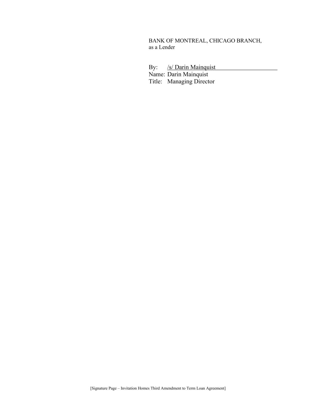 [Signature Page – Invitation Homes Third Amendment to Term Loan Agreement] BANK OF MONTREAL, CHICAGO BRANCH, as a Lender By: /s/ Darin Mainquist………………………… Name: Darin Mainquist Title: Managing Director