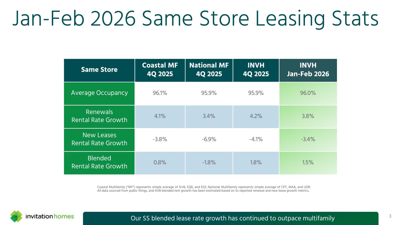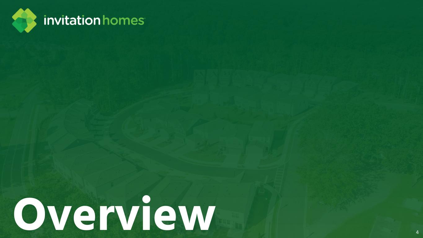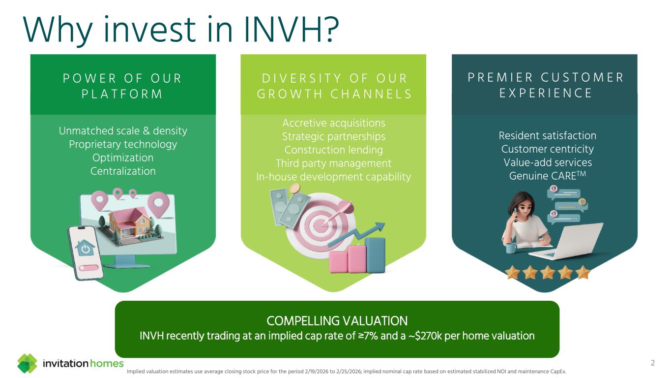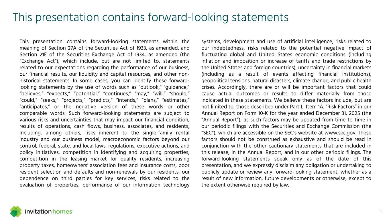 This presentation contains forward-looking statements This presentation contains forward-looking statements within the meaning of Section 27A of the Securities Act of 1933, as amended, and Section 21E of the Securities Exchange Act of 1934, as amended (the “Exchange Act”), which include, but are not limited to, statements related to our expectations regarding the performance of our business, our financial results, our liquidity and capital resources, and other non- historical statements. In some cases, you can identify these forward- looking statements by the use of words such as “outlook,” “guidance,” “believes,” “expects,” “potential,” “continues,” “may,” “will,” “should,” “could,” “seeks,” “projects,” “predicts,” “intends,” “plans,” “estimates,” “anticipates,” or the negative version of these words or other comparable words. Such forward-looking statements are subject to various risks and uncertainties that may impact our financial condition, results of operations, cash flows, business, associates, and residents, including, among others, risks inherent to the single-family rental industry and our business model, macroeconomic factors beyond our control, federal, state, and local laws, regulations, executive actions, and policy initiatives, competition in identifying and acquiring properties, competition in the leasing market for quality residents, increasing property taxes, homeowners’ association fees and insurance costs, poor resident selection and defaults and non-renewals by our residents, our dependence on third parties for key services, risks related to the evaluation of properties, performance of our information technology systems, development and use of artificial intelligence, risks related to our indebtedness, risks related to the potential negative impact of fluctuating global and United States economic conditions (including inflation and imposition or increase of tariffs and trade restrictions by the United States and foreign countries), uncertainty in financial markets (including as a result of events affecting financial institutions), geopolitical tensions, natural disasters, climate change, and public health crises. Accordingly, there are or will be important factors that could cause actual outcomes or results to differ materially from those indicated in these statements. We believe these factors include, but are not limited to, those described under Part I. Item 1A. “Risk Factors” in our Annual Report on Form 10-K for the year ended December 31, 2025 (the “Annual Report”), as such factors may be updated from time to time in our periodic filings with the Securities and Exchange Commission (the “SEC”), which are accessible on the SEC’s website at www.sec.gov. These factors should not be construed as exhaustive and should be read in conjunction with the other cautionary statements that are included in this release, in the Annual Report, and in our other periodic filings. The forward-looking statements speak only as of the date of this presentation, and we expressly disclaim any obligation or undertaking to publicly update or review any forward-looking statement, whether as a result of new information, future developments or otherwise, except to the extent otherwise required by law. 1