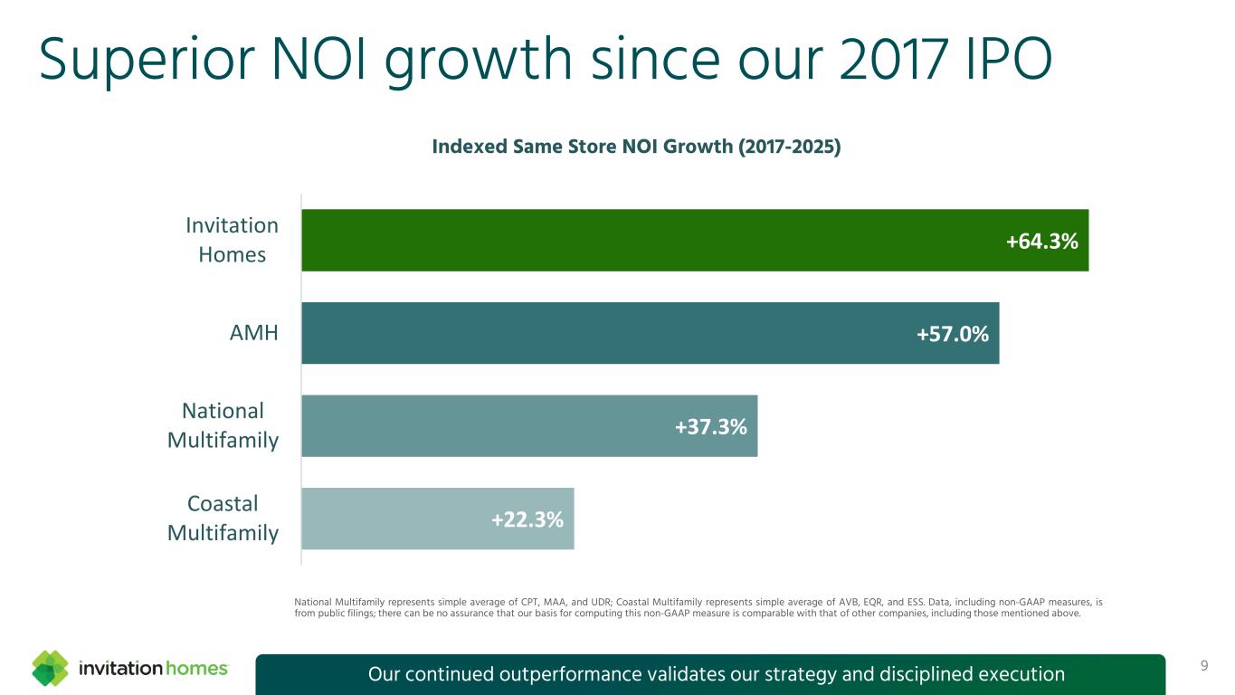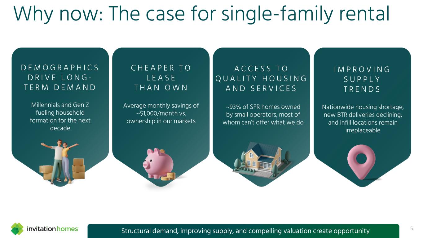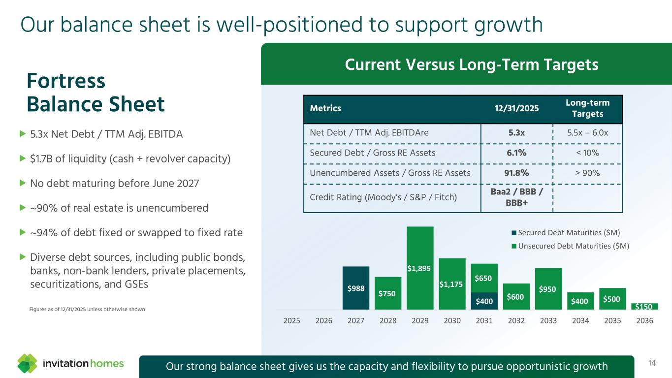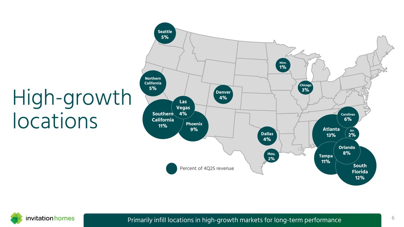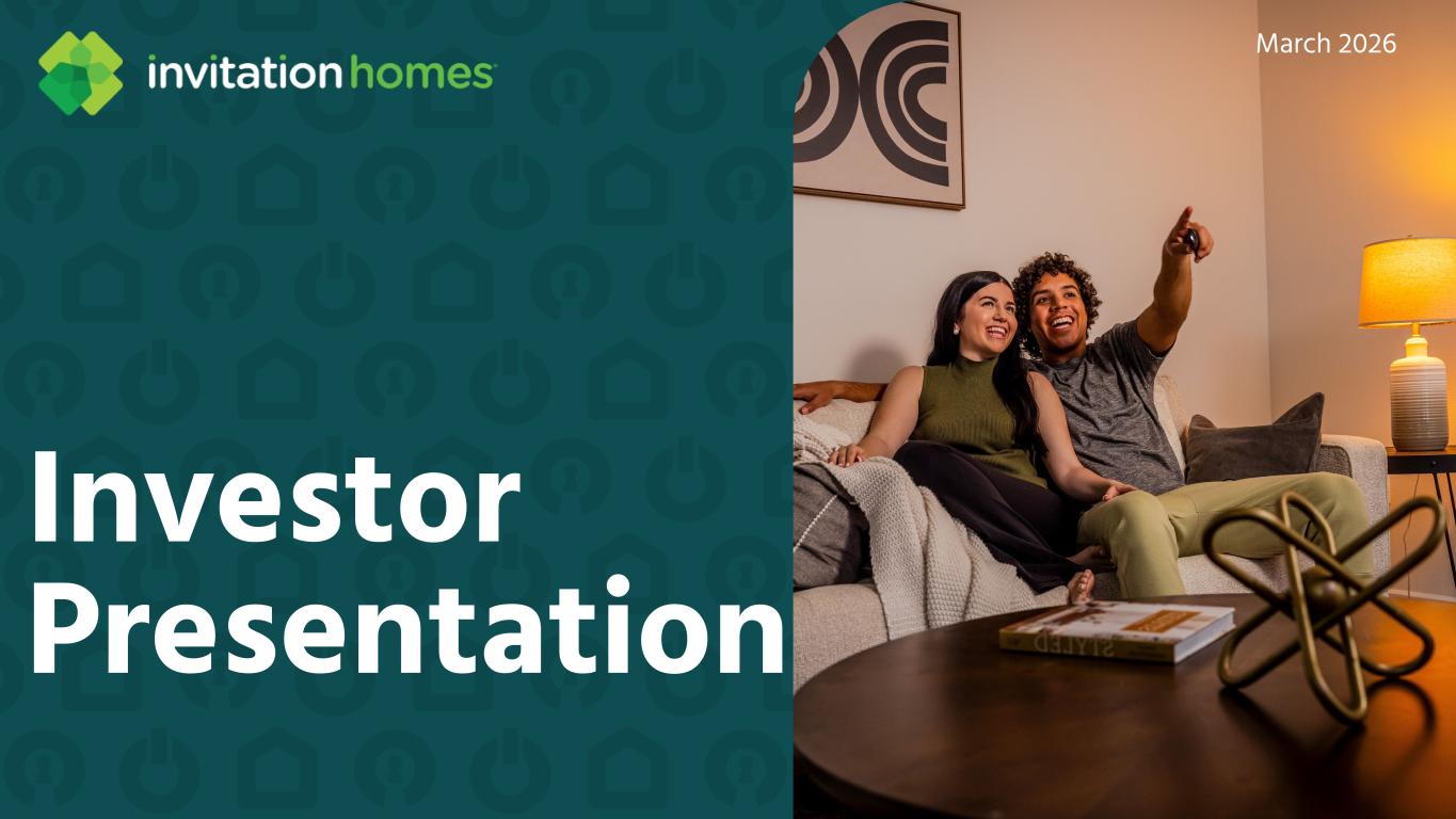 This presentation contains forward-looking statements This presentation contains forward-looking statements within the meaning of Section 27A of the Securities Act of 1933, as amended, and Section 21E of the Securities Exchange Act of 1934, as amended (the “Exchange Act”), which include, but are not limited to, statements related to our expectations regarding the performance of our business, our financial results, our liquidity and capital resources, and other non- historical statements. In some cases, you can identify these forward- looking statements by the use of words such as “outlook,” “guidance,” “believes,” “expects,” “potential,” “continues,” “may,” “will,” “should,” “could,” “seeks,” “projects,” “predicts,” “intends,” “plans,” “estimates,” “anticipates,” or the negative version of these words or other comparable words. Such forward-looking statements are subject to various risks and uncertainties that may impact our financial condition, results of operations, cash flows, business, associates, and residents, including, among others, risks inherent to the single-family rental industry and our business model, macroeconomic factors beyond our control, federal, state, and local laws, regulations, executive actions, and policy initiatives, competition in identifying and acquiring properties, competition in the leasing market for quality residents, increasing property taxes, homeowners’ association fees and insurance costs, poor resident selection and defaults and non-renewals by our residents, our dependence on third parties for key services, risks related to the evaluation of properties, performance of our information technology systems, development and use of artificial intelligence, risks related to our indebtedness, risks related to the potential negative impact of fluctuating global and United States economic conditions (including inflation and imposition or increase of tariffs and trade restrictions by the United States and foreign countries), uncertainty in financial markets (including as a result of events affecting financial institutions), geopolitical tensions, natural disasters, climate change, and public health crises. Accordingly, there are or will be important factors that could cause actual outcomes or results to differ materially from those indicated in these statements. We believe these factors include, but are not limited to, those described under Part I. Item 1A. “Risk Factors” in our Annual Report on Form 10-K for the year ended December 31, 2025 (the “Annual Report”), as such factors may be updated from time to time in our periodic filings with the Securities and Exchange Commission (the “SEC”), which are accessible on the SEC’s website at www.sec.gov. These factors should not be construed as exhaustive and should be read in conjunction with the other cautionary statements that are included in this release, in the Annual Report, and in our other periodic filings. The forward-looking statements speak only as of the date of this presentation, and we expressly disclaim any obligation or undertaking to publicly update or review any forward-looking statement, whether as a result of new information, future developments or otherwise, except to the extent otherwise required by law. 1