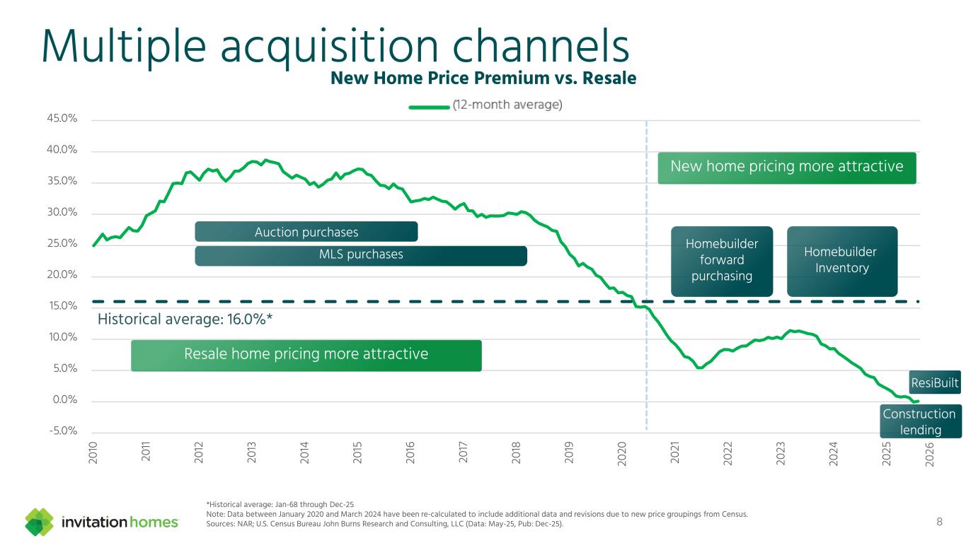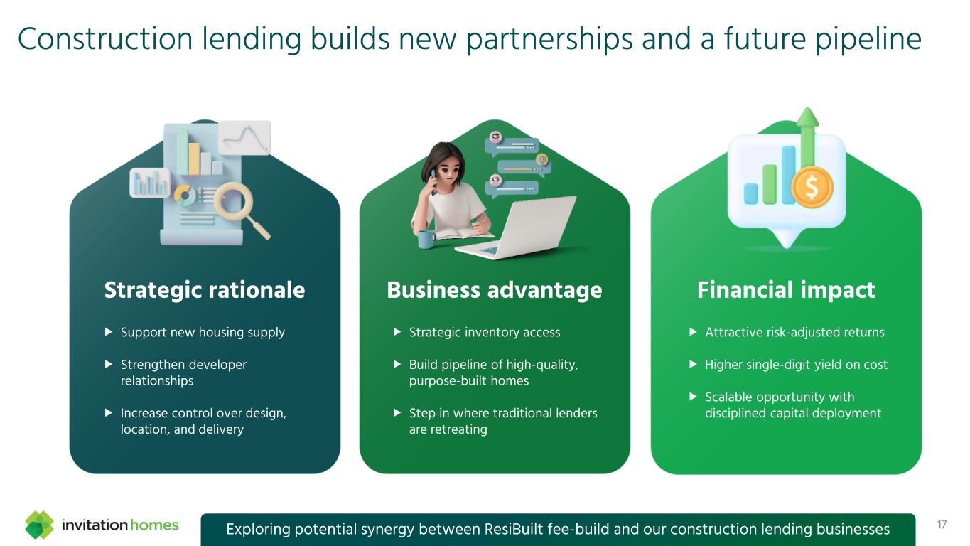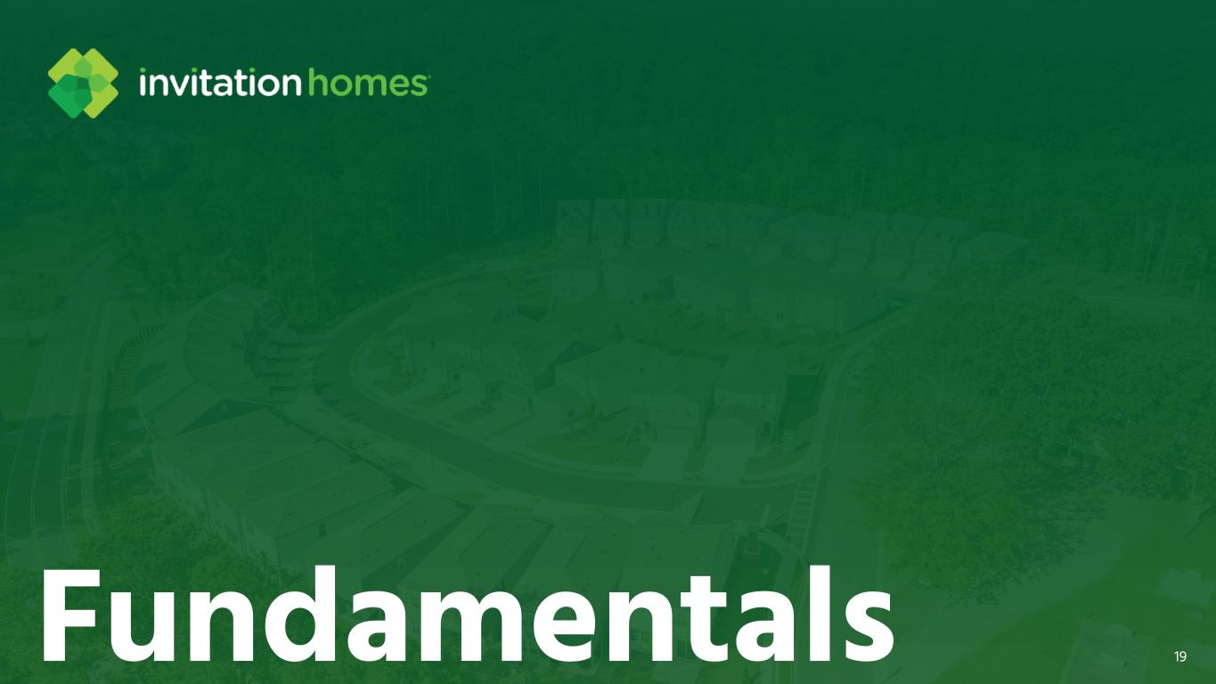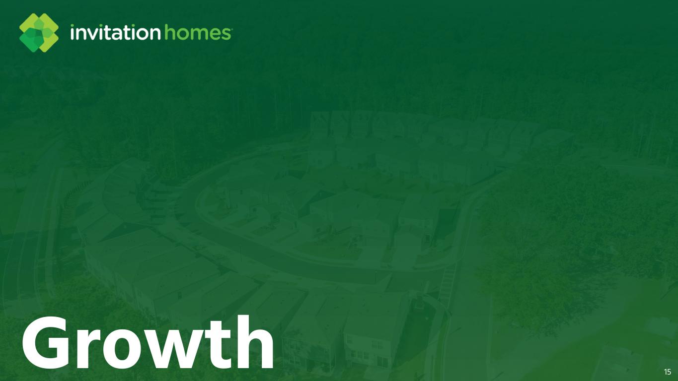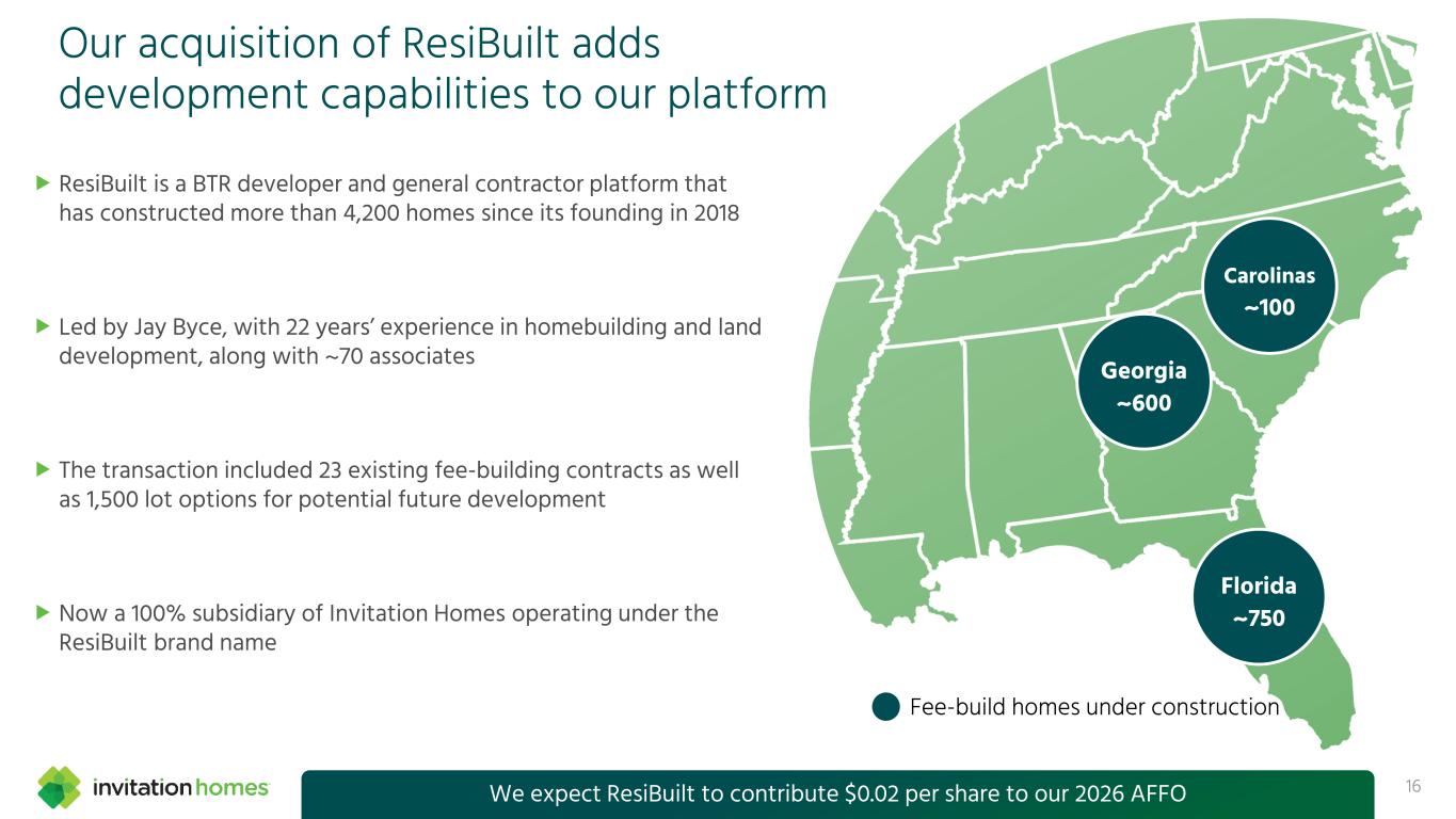Our acquisition of ResiBuilt adds development capabilities to our platform 16 Florida ~750 Georgia ~600 Carolinas ~100 Fee-build homes under construction We expect ResiBuilt to contribute $0.02 per share to our 2026 AFFO ResiBuilt is a BTR developer and general contractor platform that has constructed more than 4,200 homes since its founding in 2018 Led by Jay Byce, with 22 years’ experience in homebuilding and land development, along with ~70 associates The transaction included 23 existing fee-building contracts as well as 1,500 lot options for potential future development Now a 100% subsidiary of Invitation Homes operating under the ResiBuilt brand name