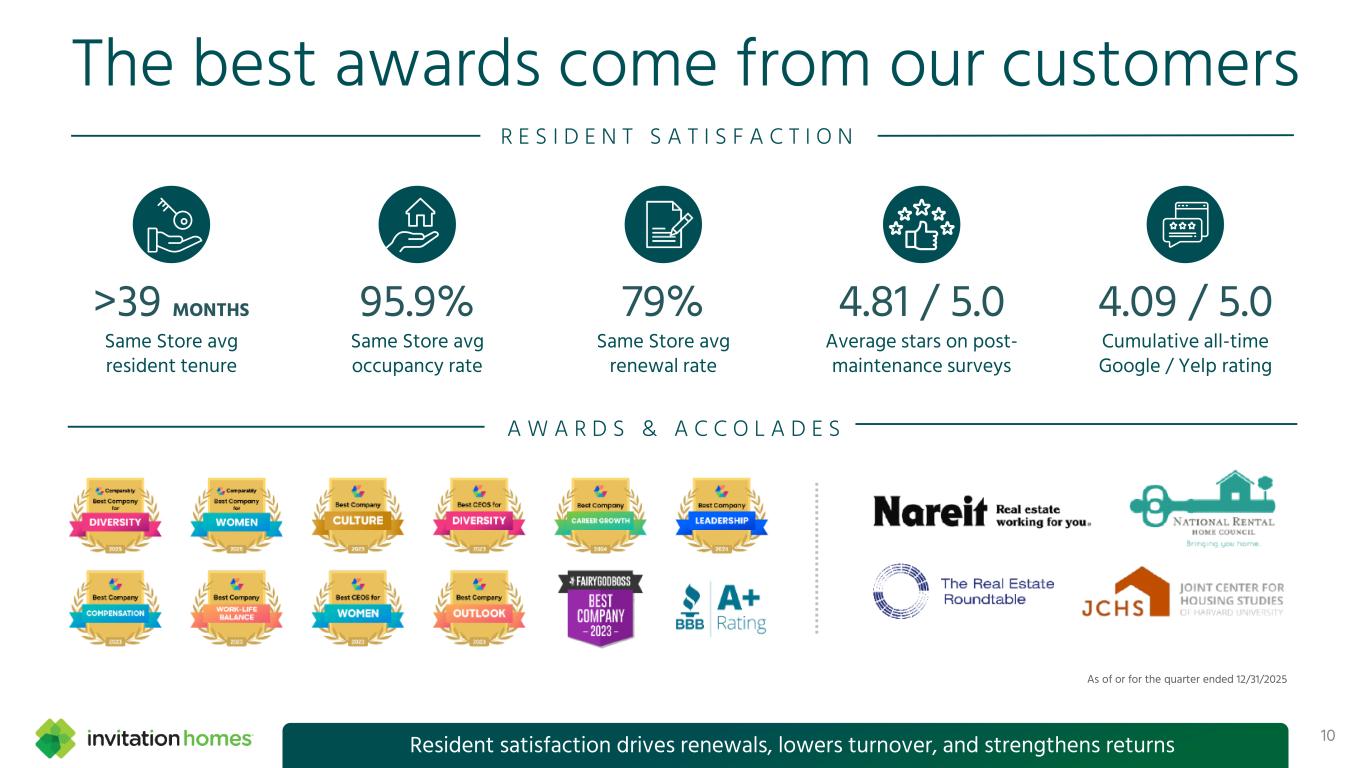 Superior NOI growth since our 2017 IPO 9 National Multifamily represents simple average of CPT, MAA, and UDR; Coastal Multifamily represents simple average of AVB, EQR, and ESS. Data, including non-GAAP measures, is from public filings; there can be no assurance that our basis for computing this non-GAAP measure is comparable with that of other companies, including those mentioned above. Our continued outperformance validates our strategy and disciplined execution +64.3% +57.0% +37.3% +22.3% Invitation Homes AMH National Multifamily Coastal Multifamily Indexed Same Store NOI Growth (2017-2025)