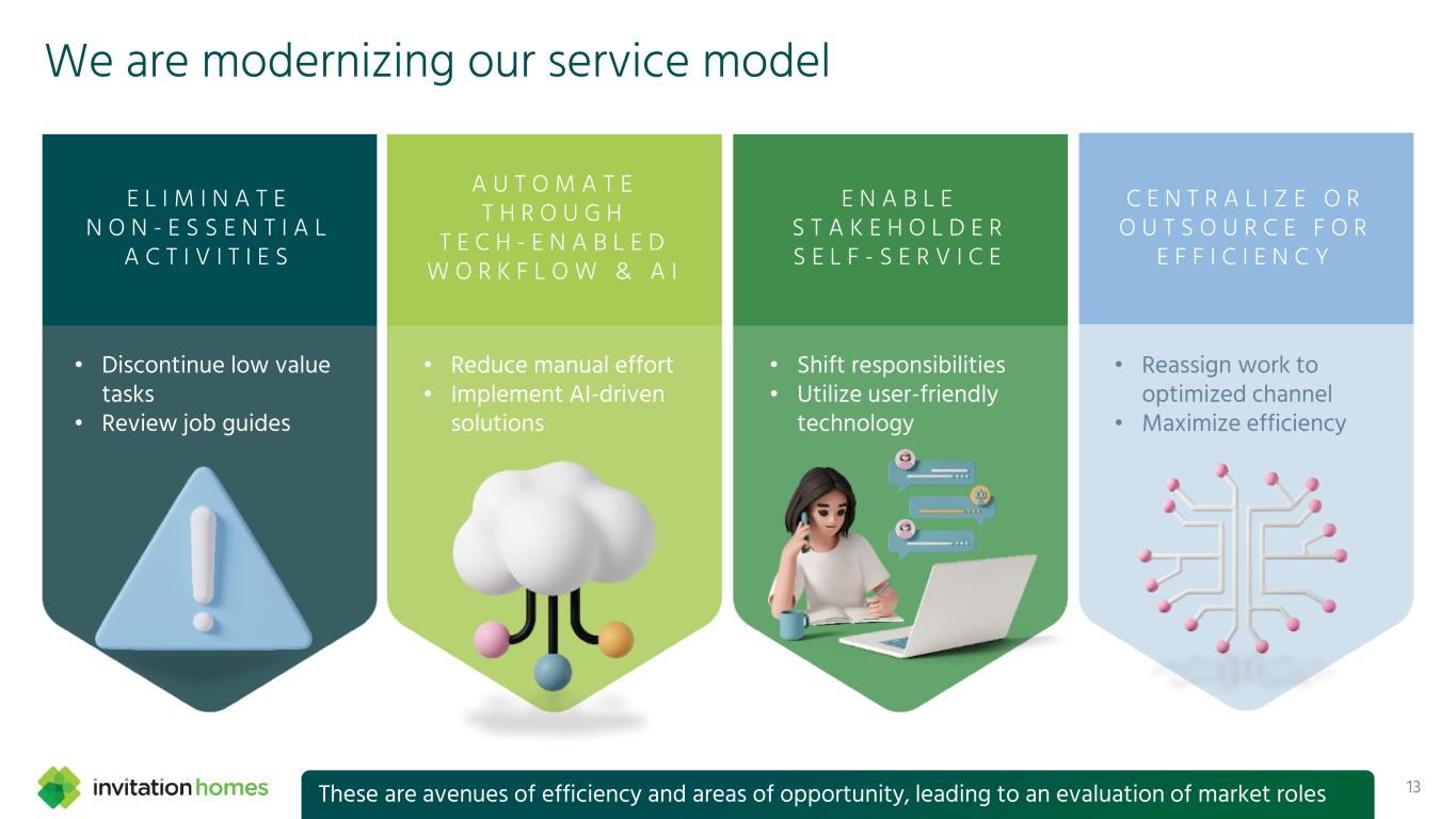 We provide a differentiated maintenance experience We offer a unique package of value-add services 12 Attract Convert Move outRetain Renew Customer explores & finds their perfect home Customer chooses their home & applies Customer leaves home Customer enjoys their home and the easy “Leasing Lifestyle” Customer decides whether to stay An overview of the customer journey — and what makes our approach great for customers and investors We price intelligently We offer lease term flexibility