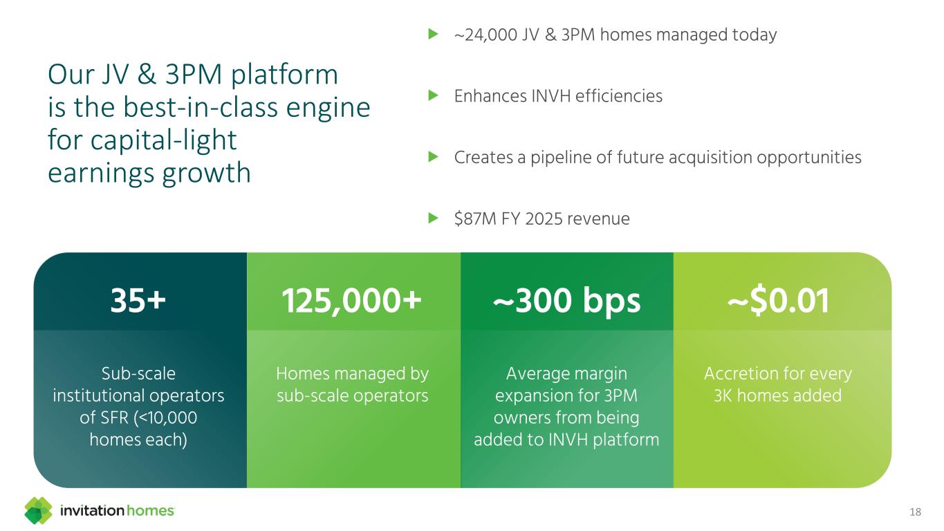 18 ~300 bps Average margin expansion for 3PM owners from being added to INVH platform 35+ Sub-scale institutional operators of SFR (<10,000 homes each) 125,000+ Homes managed by sub-scale operators ~$0.01 Accretion for every 3K homes added ~24,000 JV & 3PM homes managed today Enhances INVH efficiencies Creates a pipeline of future acquisition opportunities $87M FY 2025 revenue Our JV & 3PM platform is the best-in-class engine for capital-light earnings growth